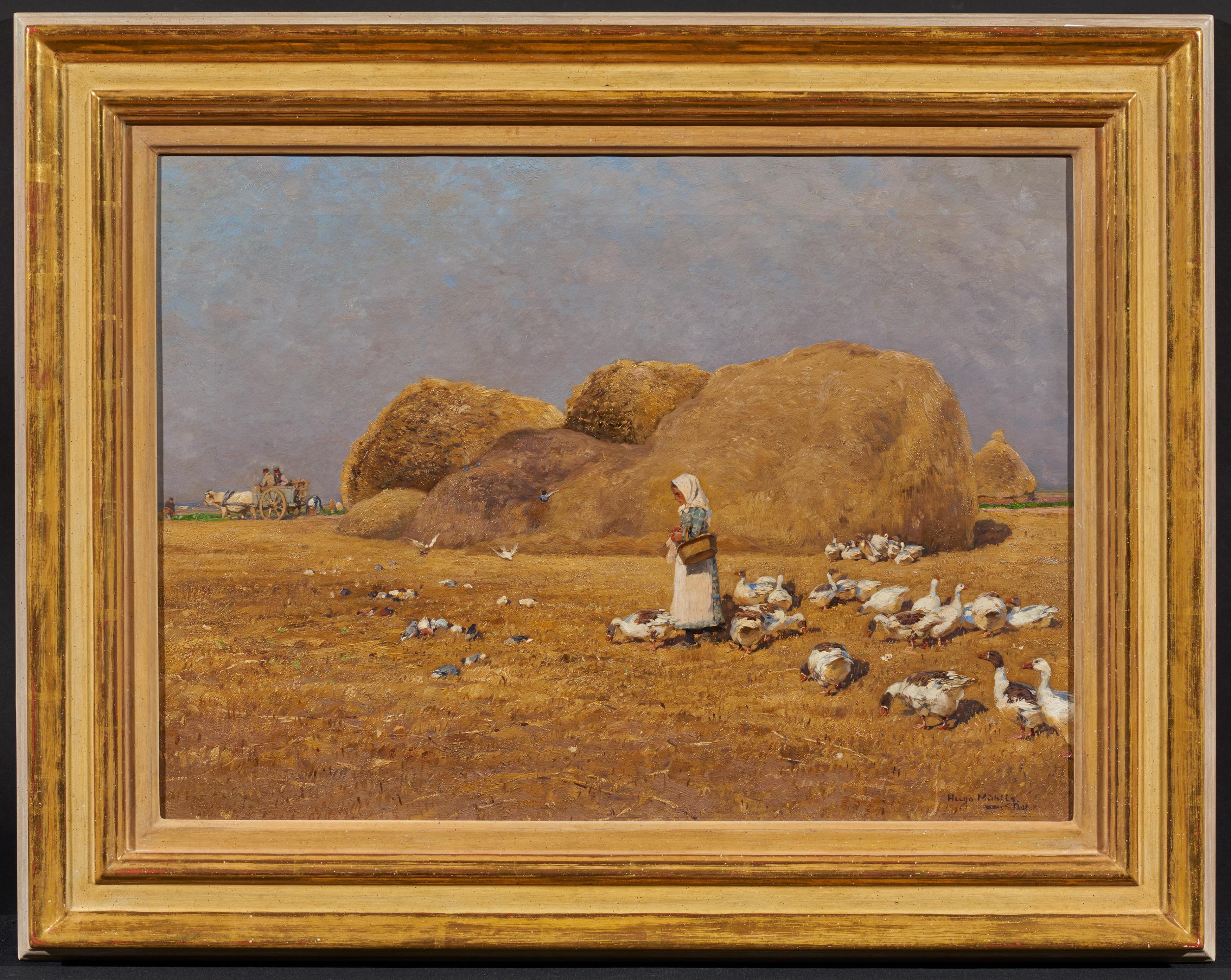 Titel: Mädchen mit Gänseschar auf abgeernteten Feldern.
