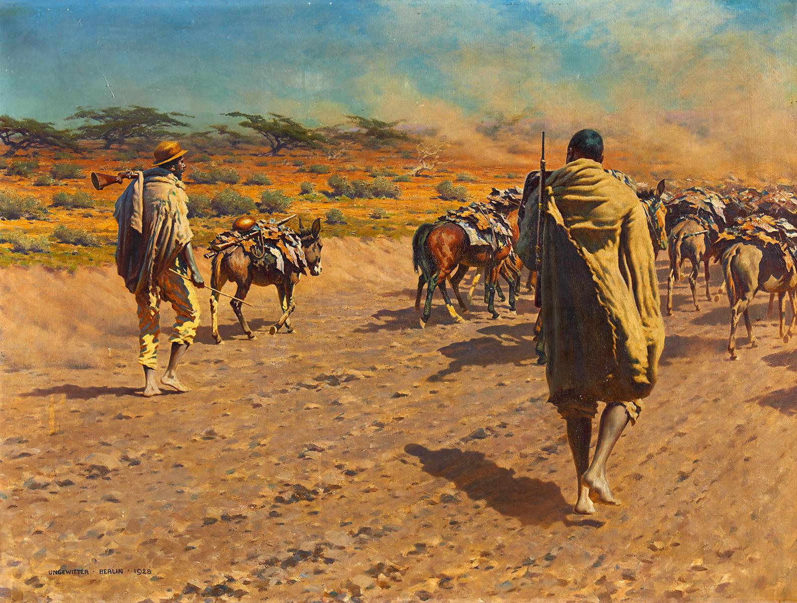 Titel: Fellhändler mit Pferdenin der afrikanischen Savanne.