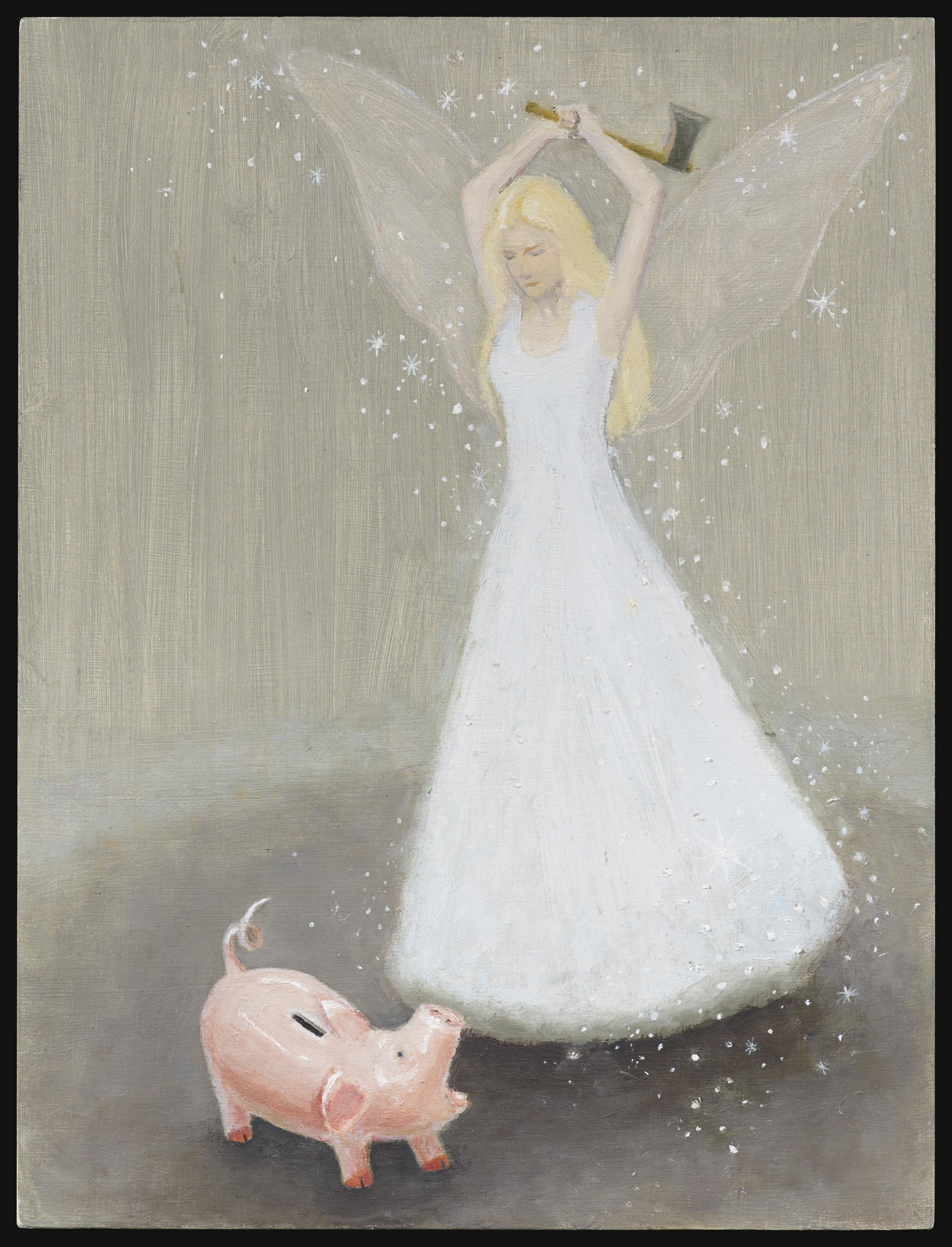 "Mit vor Schreck geöffnetem Mund versucht ein junger Mann dem augenscheinlich wenig zimperlichen Treiben zweier Frauen zu entkommen. Mit hocherhobenem Besen und Wassereimer verjagen sie ihn aus ihrem Etablissement. Lambert Doomer wählt das im holländischen Barock vielfach erzählte biblische Gleichnis des verlorenen Sohnes bei den Dirnen, der seine Zeche nicht bezahlen kann, zum Bildmotiv. Wie die feenhafte Schwester der besenschwingenden Wirtin erscheint hingegen das Mädchen von Irene Bisang im weißen Kleid mit Flügeln und von Glitzerstaub umweht. In größtmöglichem Kontrast zu ihrer zauberhaften Erscheinung steht die grimmige Entschlossenheit mit der sie die Axt emporhebt und gegen das ängstlich dreinblickende Sparschweinchen richtet. Mit dieser furienhaften Gestik steht sie den beiden Damen aus dem Barockzeitalter in nichts nach. Augenscheinlich verstehen nicht nur geschäftstüchtige Bordellwirtinnen, sondern auch elfengleiche, blonde Mädchen in Finanzdingen keinen Spaß - egal in welchem Jahrhundert.