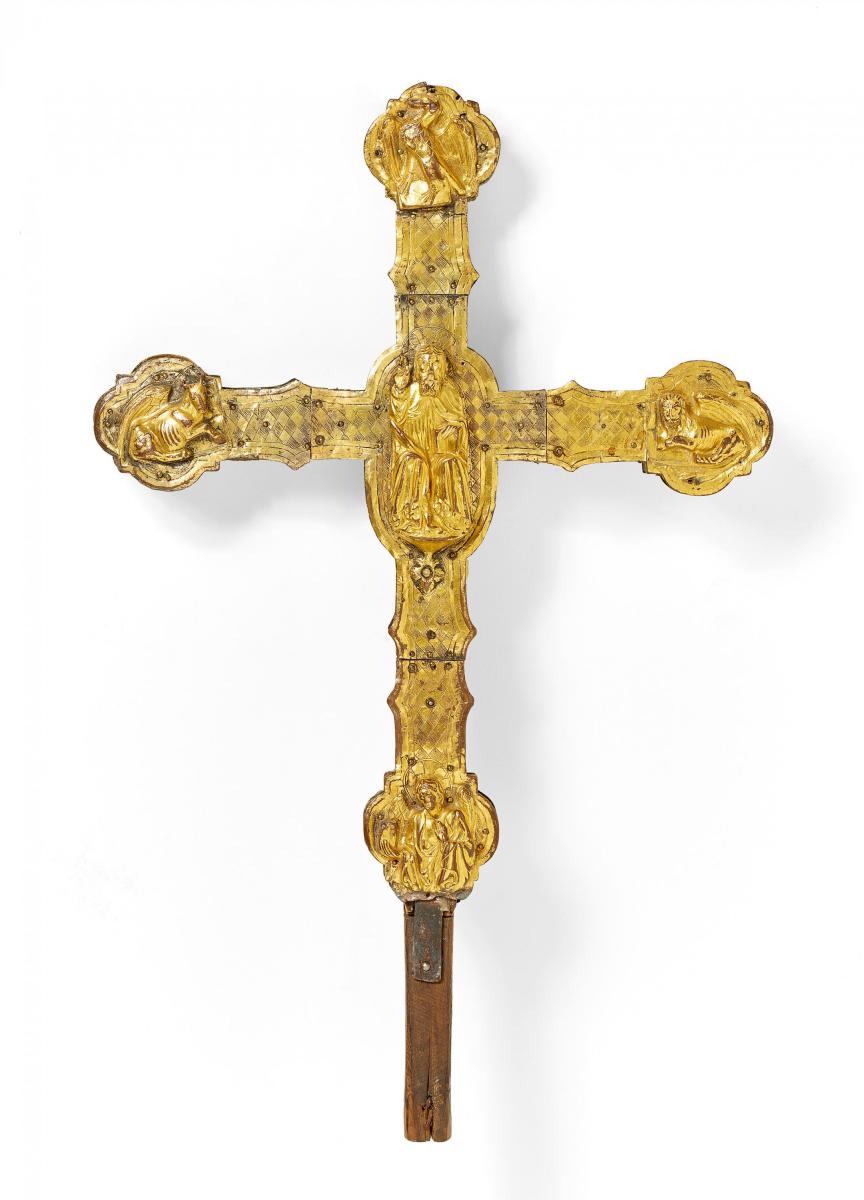 Technik: Holzkern beschlagen mit Kupfer, dieses tlw. getrieben, graviert und vergoldet.