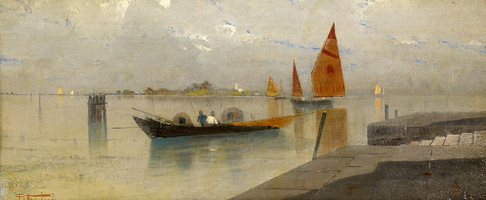 Fischerboote vor Venedig. Unten links: P. Fragiacomo. Öl auf Leinwand. 21 x 48cm. Rahmen.