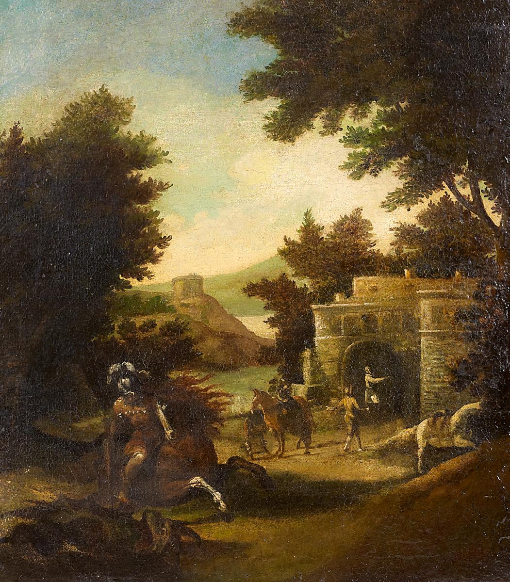 Landschaft mit Hl. Georg und dem Drachen. Öl auf Leinwand. Auf Karton gezogen. 57,5 x 51cm. Rahmen.
