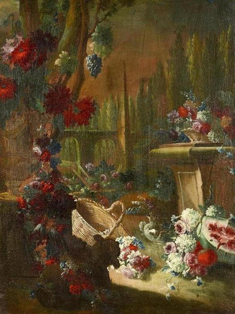 Stillleben mit Granatapfel und Blumen in einer Parklandschaft. Öl auf Leinwand. Doubliert. 63 x 47,5cm. Rahmen.