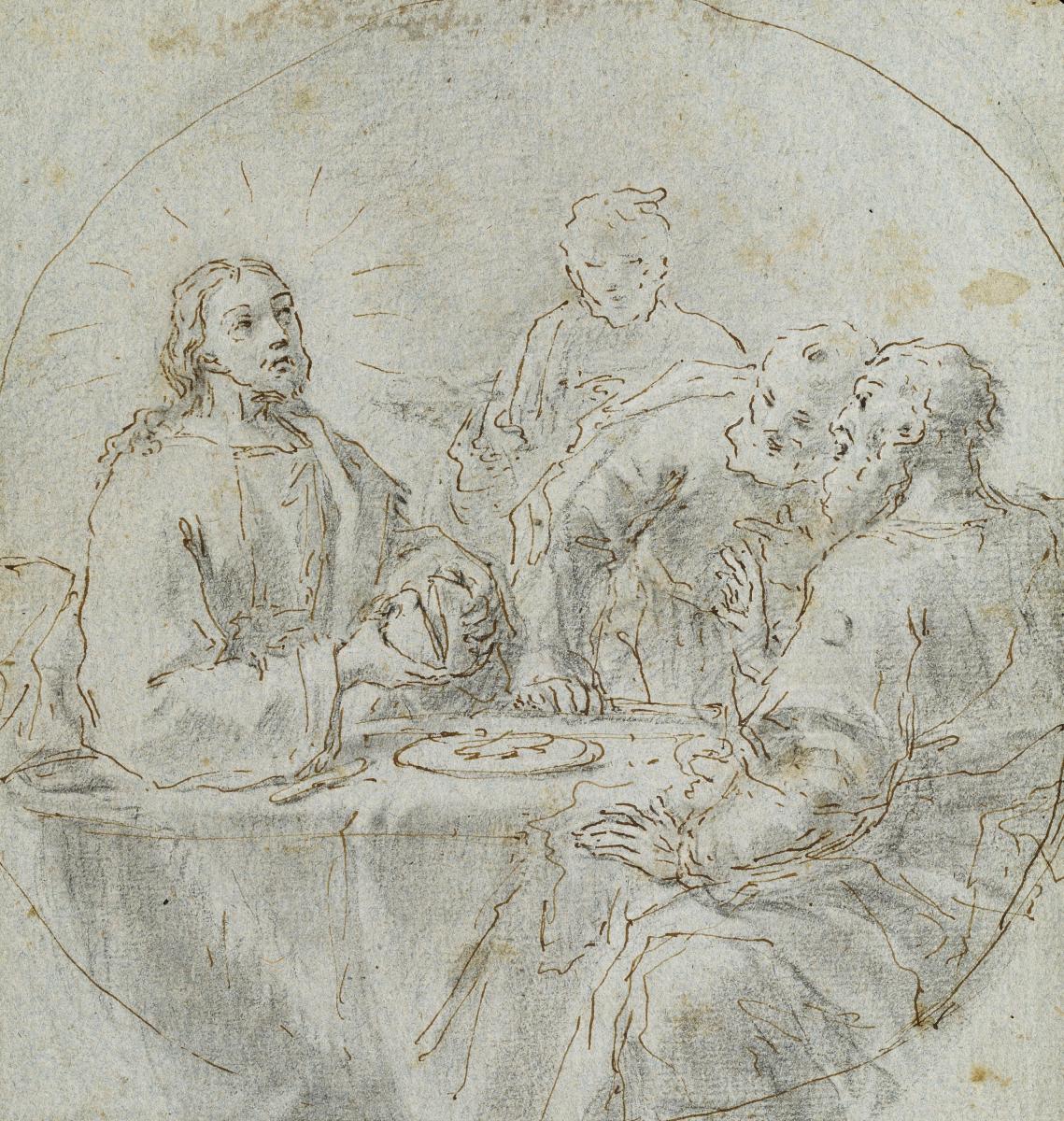 Abendmahl in Emmaus. Federzeichnung über schwarzem Stift auf Papier. Kaschiert. 20,5 x 19cm. Rahmen.