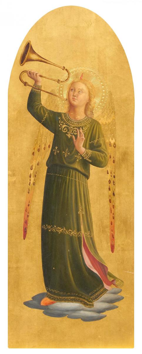 Titel: "Posaunenengel" vor Goldhintergrund im vergoldeten Tabernakelrahmen.