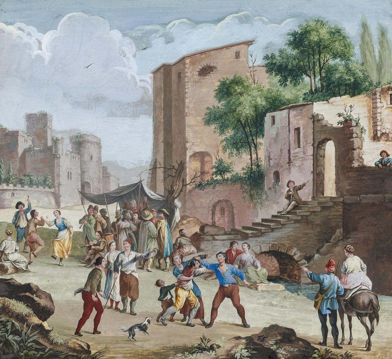 Tanzende und Raufende in einem italienischen Dorf. Gouache auf Papier. Montiert. 25 x 28cm. Monogrammiert unten rechts: FF. Rahmen.