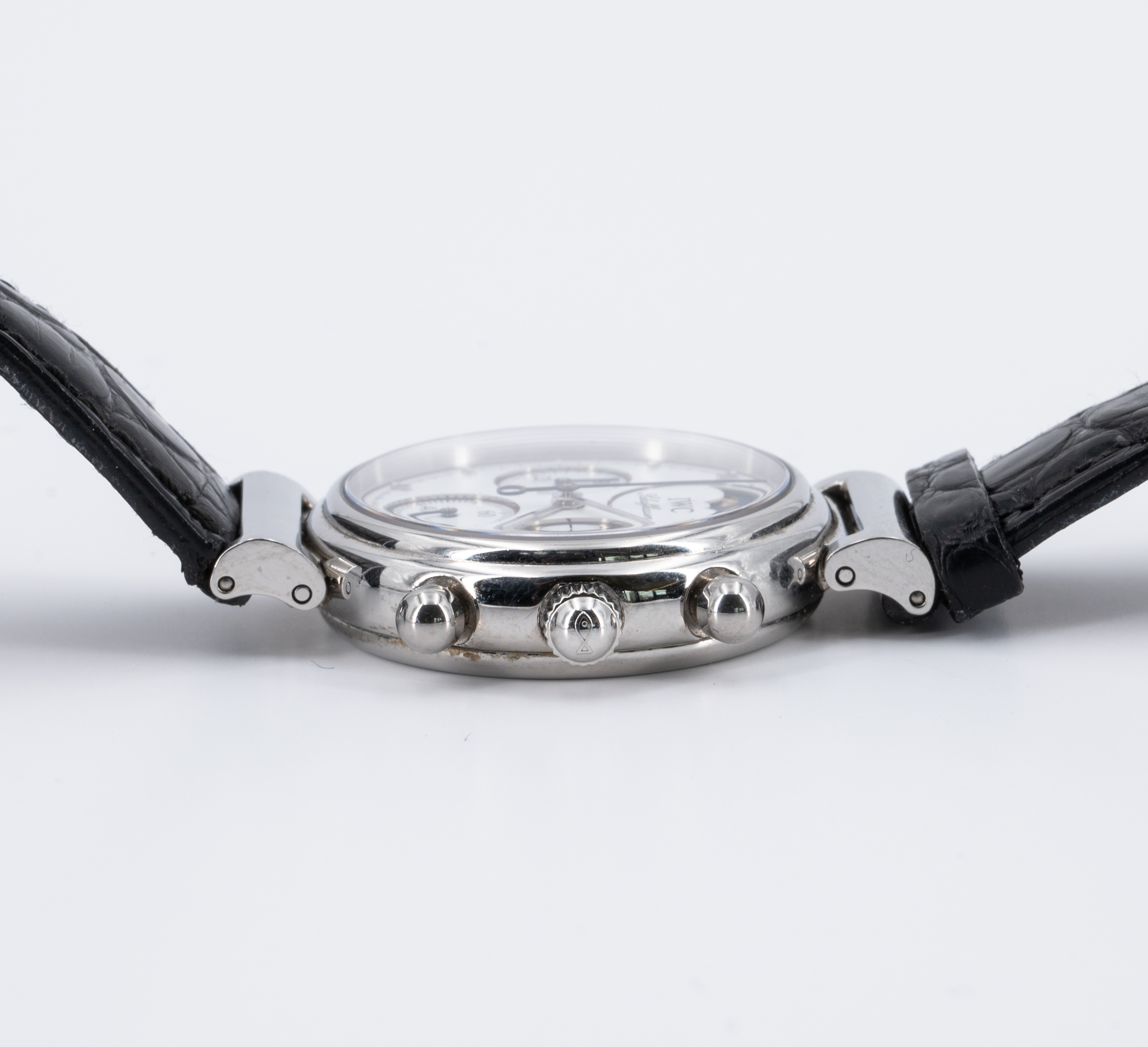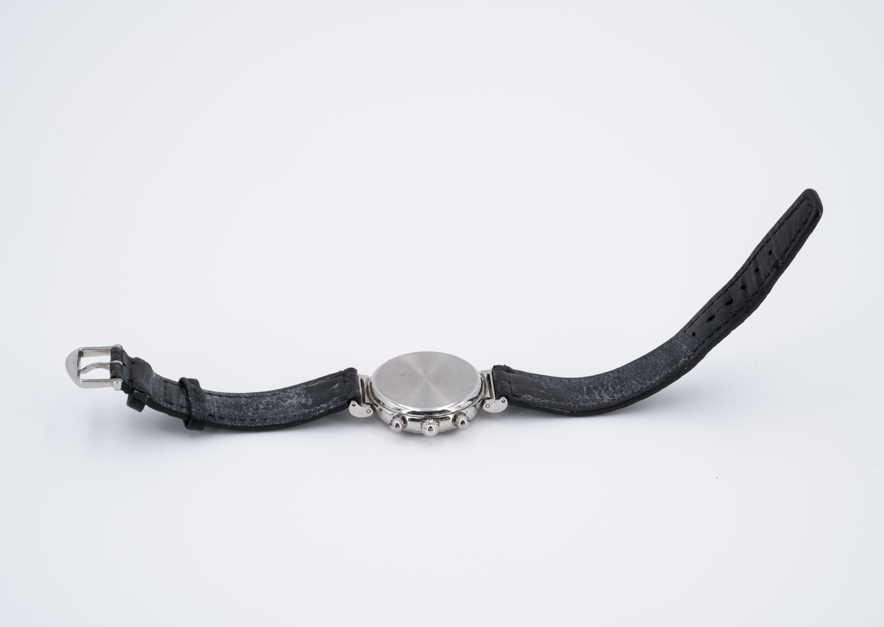 Gehäuse/Armband: Stahl, schwarzes Lederarmband mit orig. Dornschließe, Zffbl. weiß-lackiert, Zeiger silbern mit Leuchtmasse, Sekundenzeiger gebläut.