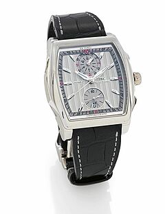 Beschreibung: Flyback-Funktion, limitierte Auflage 141/500, verschraubte Krone, Saphirglas. Das rückseitige Fenster zum Werk noch verklebt.