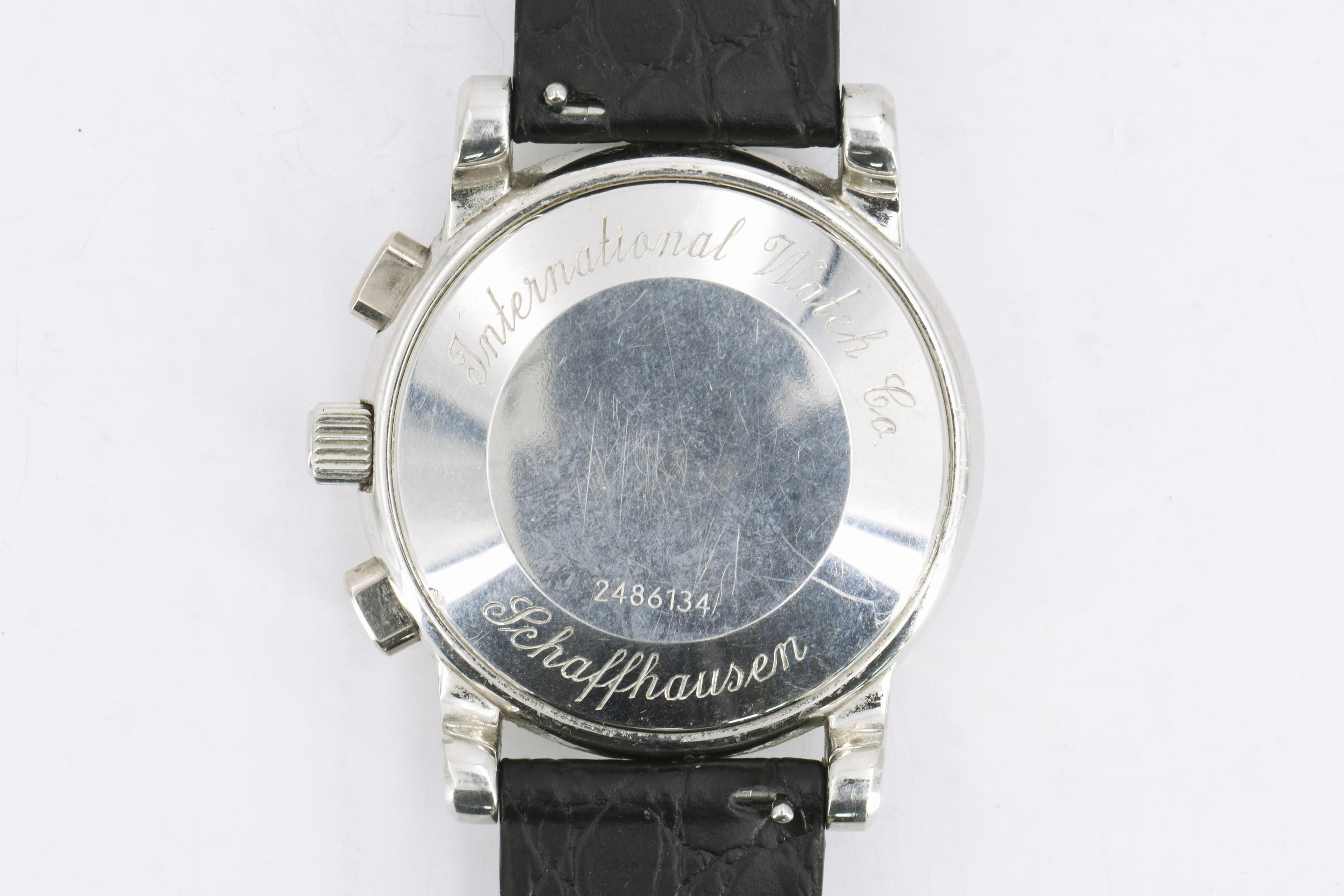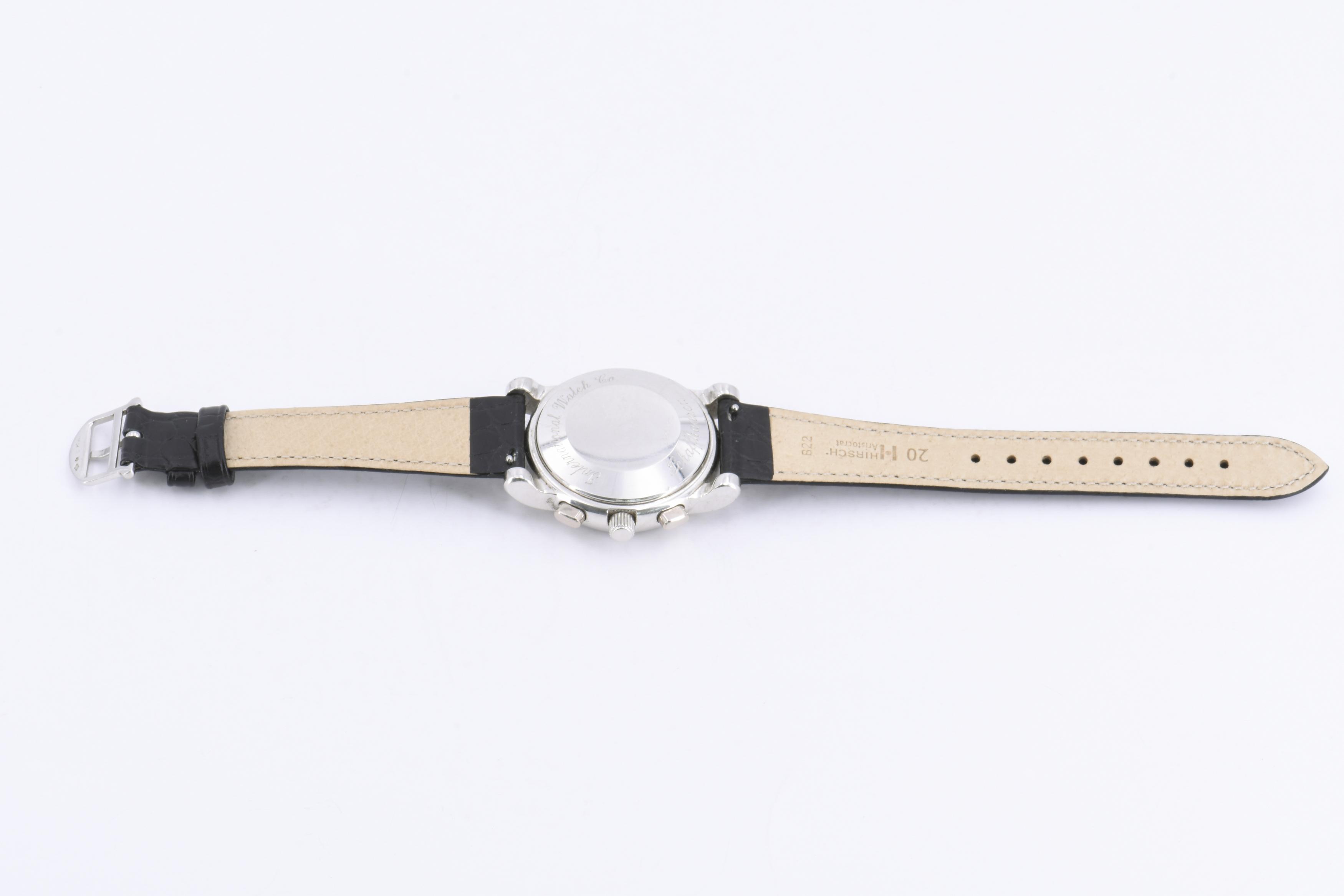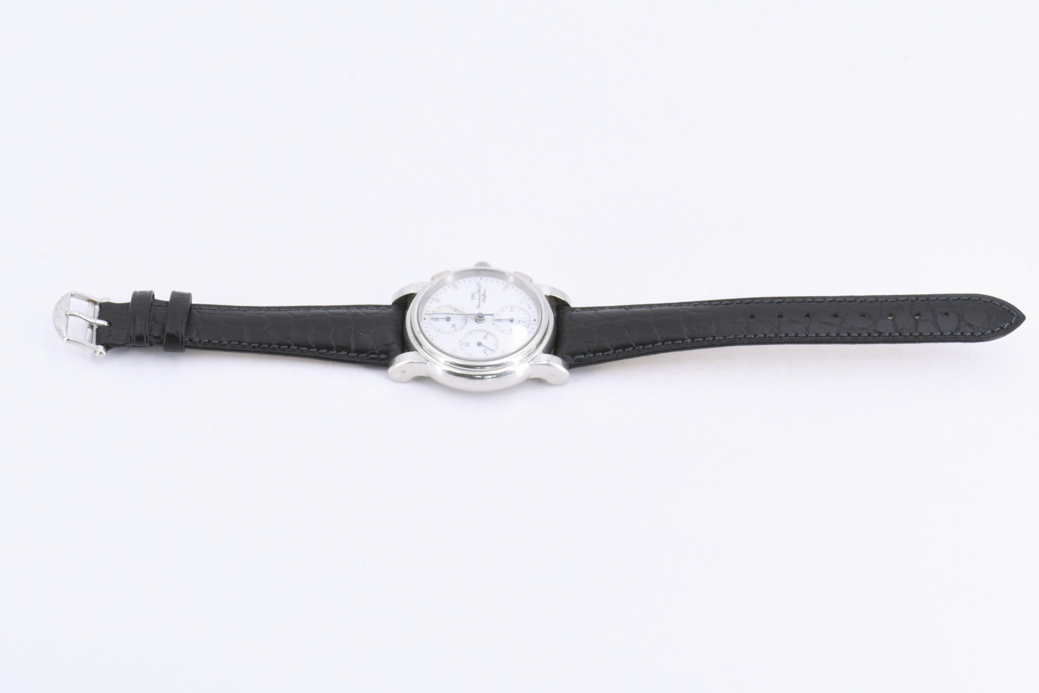 Beschreibung: IWC Chronograph mit Platin Gehäuse. Weißes Zifferblatt mit silberfarbenen Indexen und Tritium Leuchtmasse punktiert. Datum auf "6" Uhr im Totalisator Stundenzähler. Minutenzähler bei "12" Uhr, kleine dezentrale Sekunde auf "9" Uhr. Einseitiger Automatischer Aufzug und Datumschnellschaltung. Drücker bei "2" und "4" Uhr für Chronographenfunktion. Neues Lederarmband.