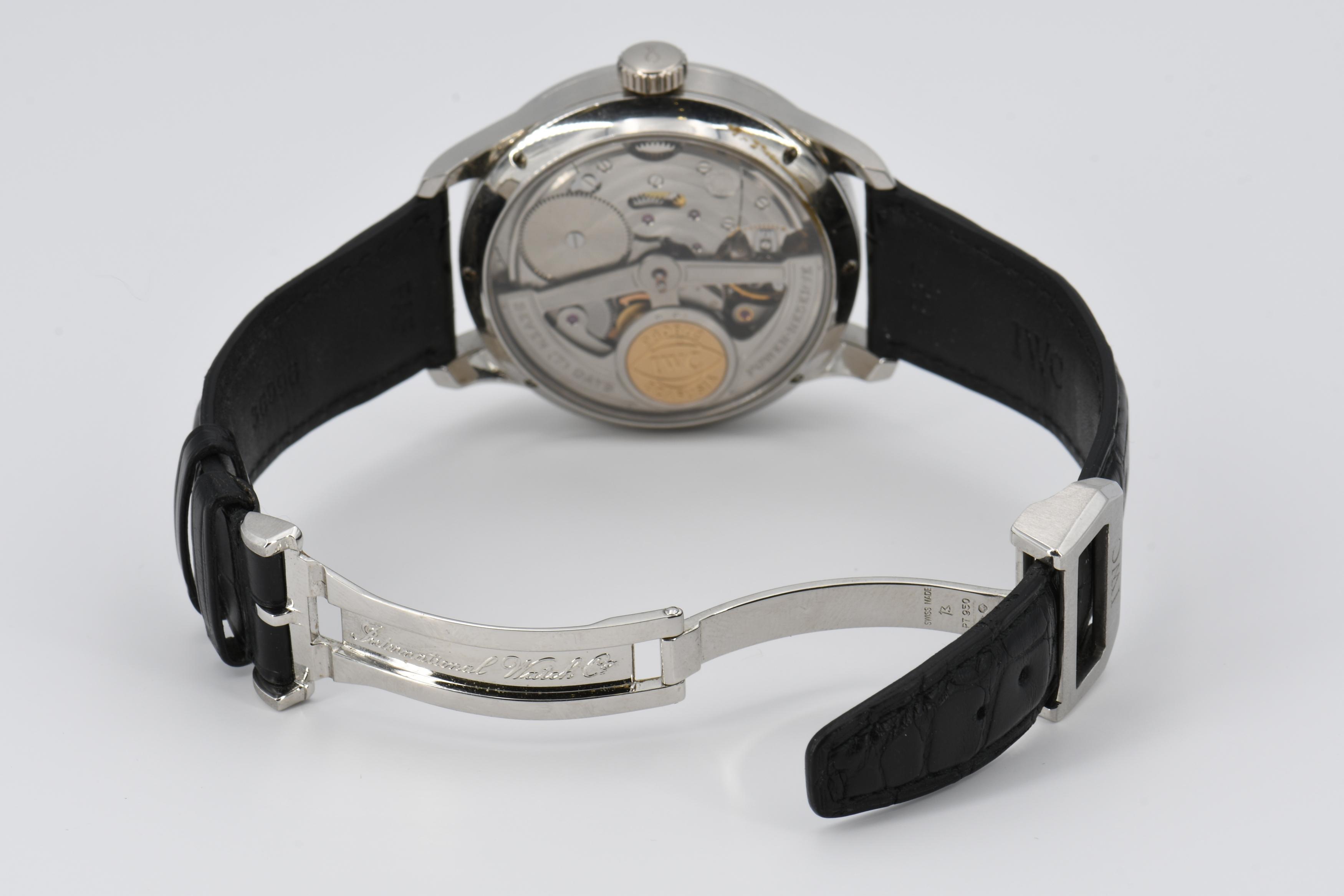Gehäuse/Armband: Platin, orig.-Lederarmband mit orig.-Faltschließe, Zffbl. silbern, Zeiger/Indizes silbern, z.T. gebläut.