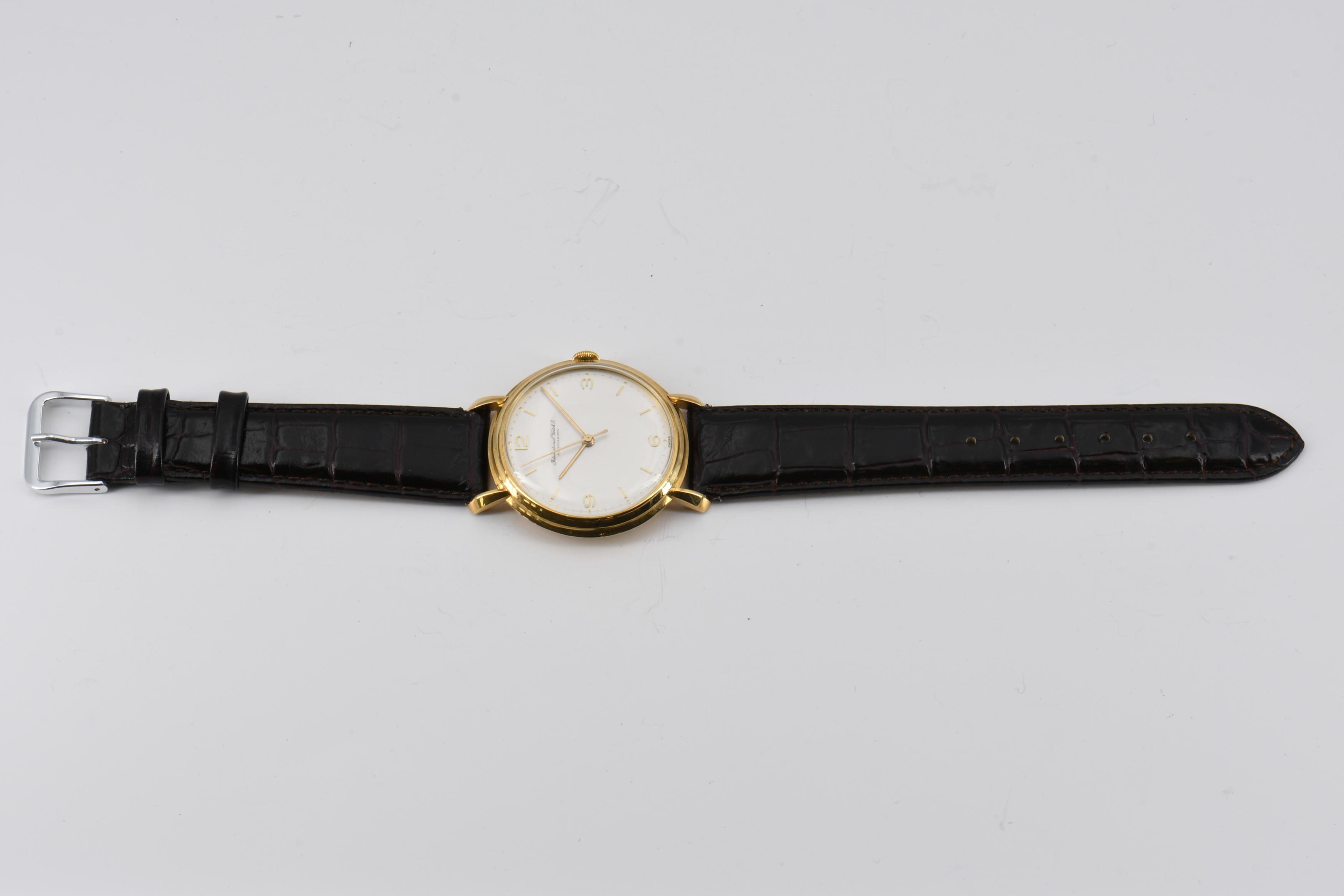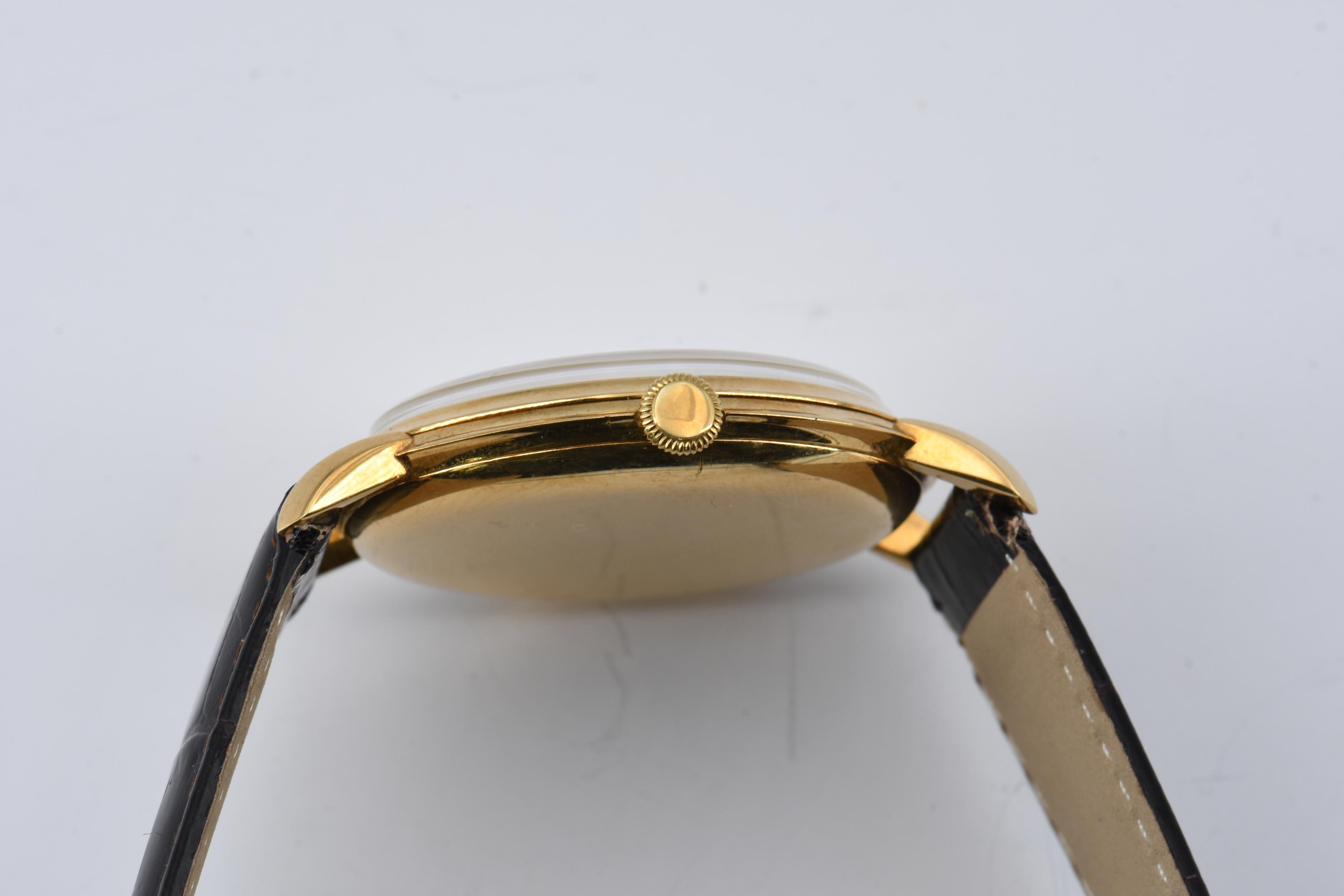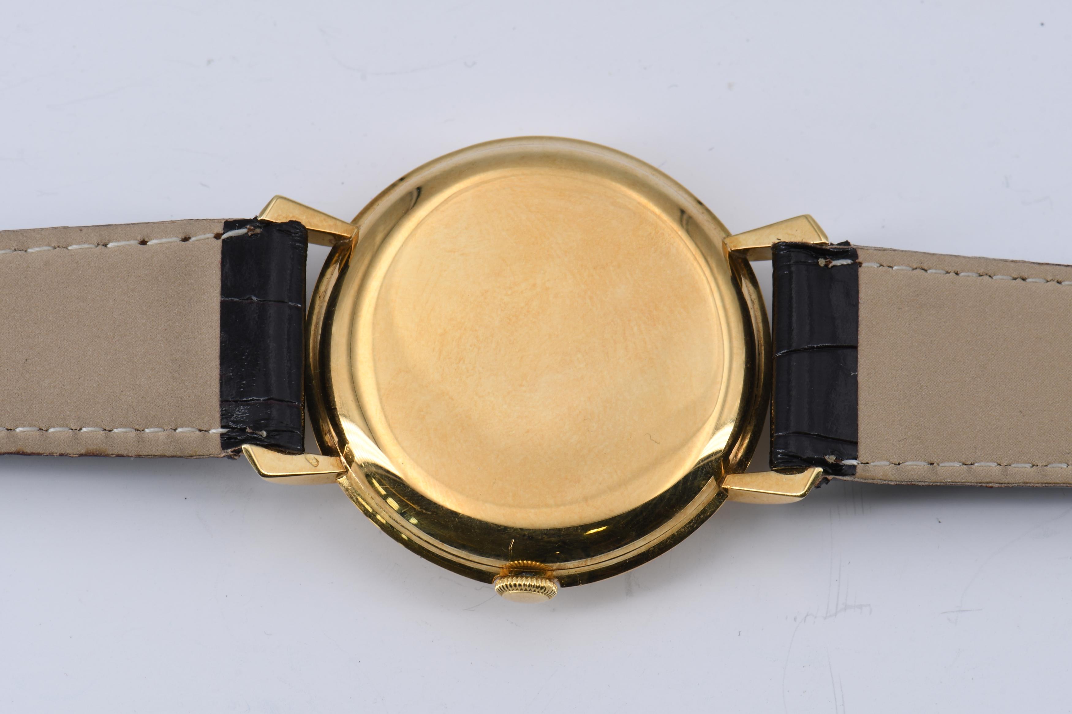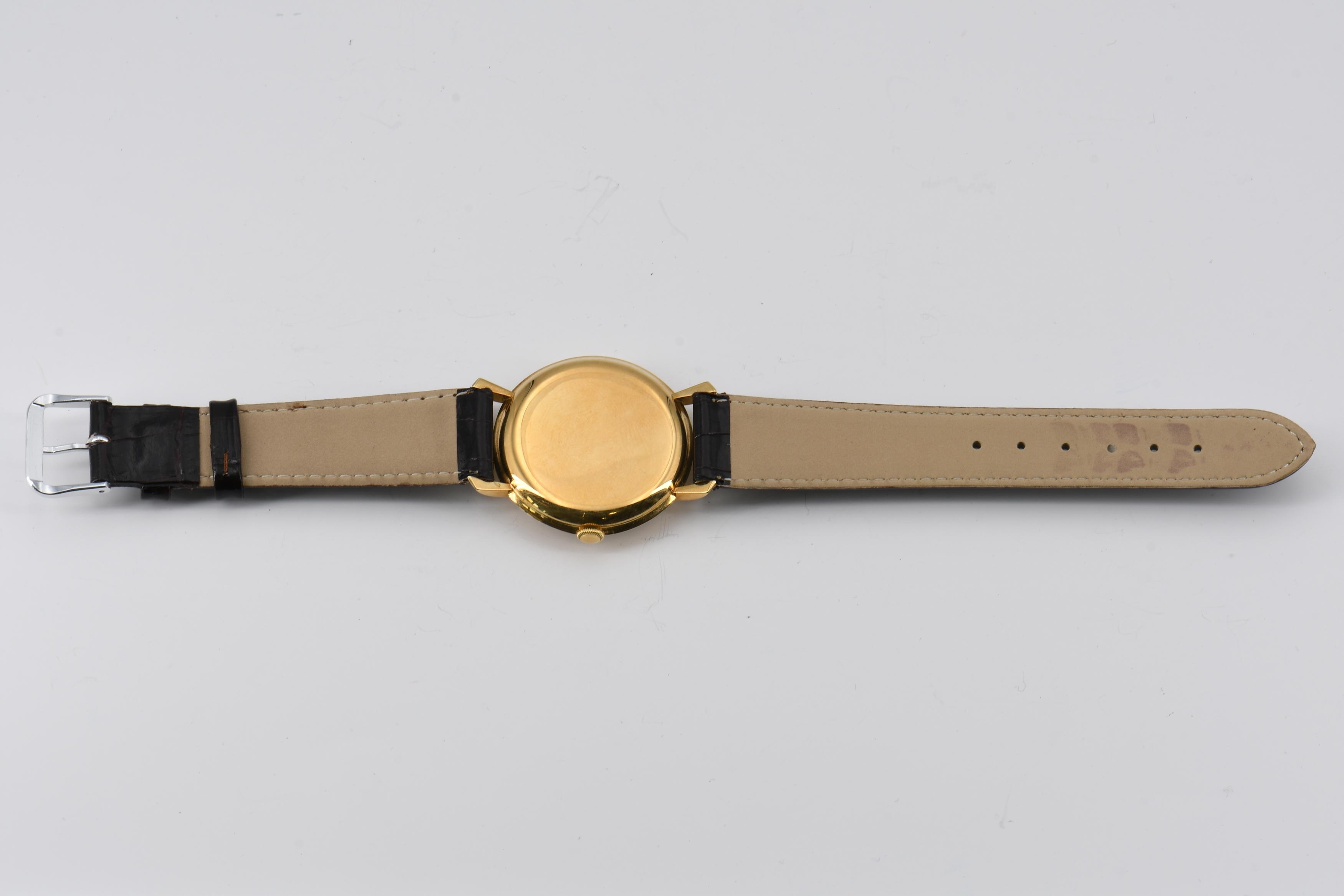 Gehäuse/Armband: 750/- Gelbgold, schwarzes Lederband, Dornschließe, silbernes Zffbl., goldene Zeiger.