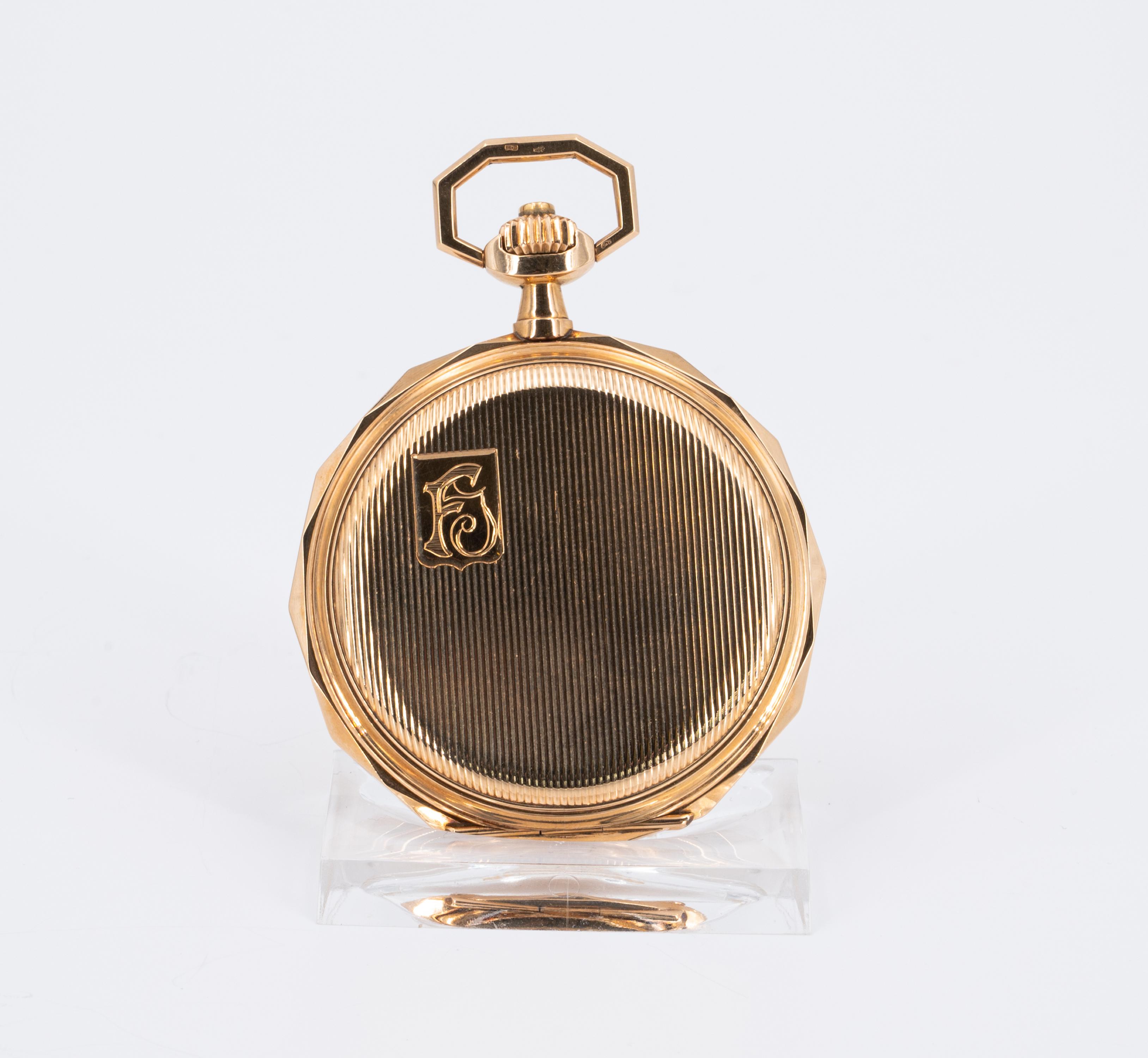 Beschreibung: 2-Zeiger-Taschenuhr mit dezentraler Sekunde bei "6" Uhr. Unruh mit Kompensation und