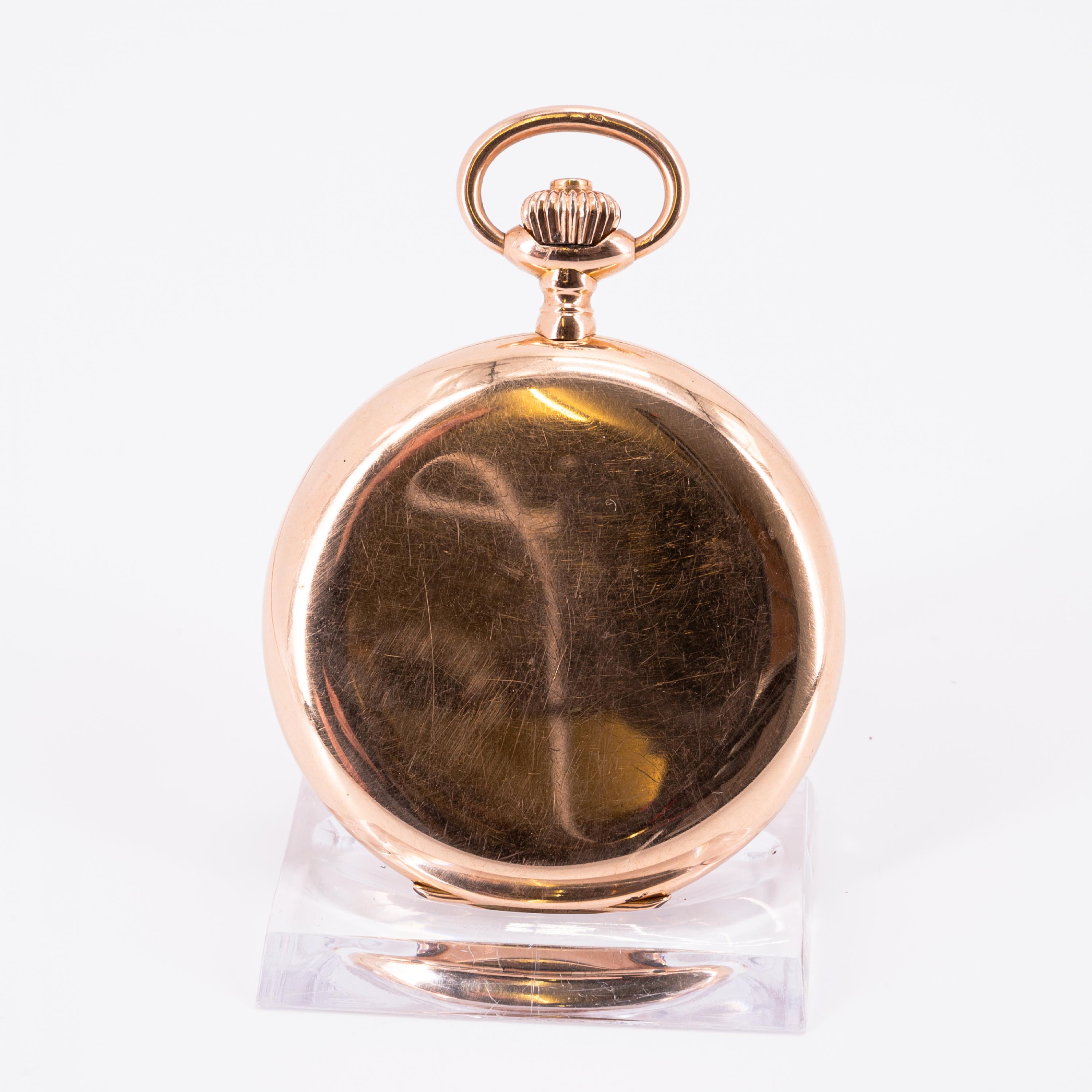 Gehäuse/Armband: 585/- Rotgold, Email-Zffbl. weiß, Zeiger rotgolden, arabische Ziffern schwarz.