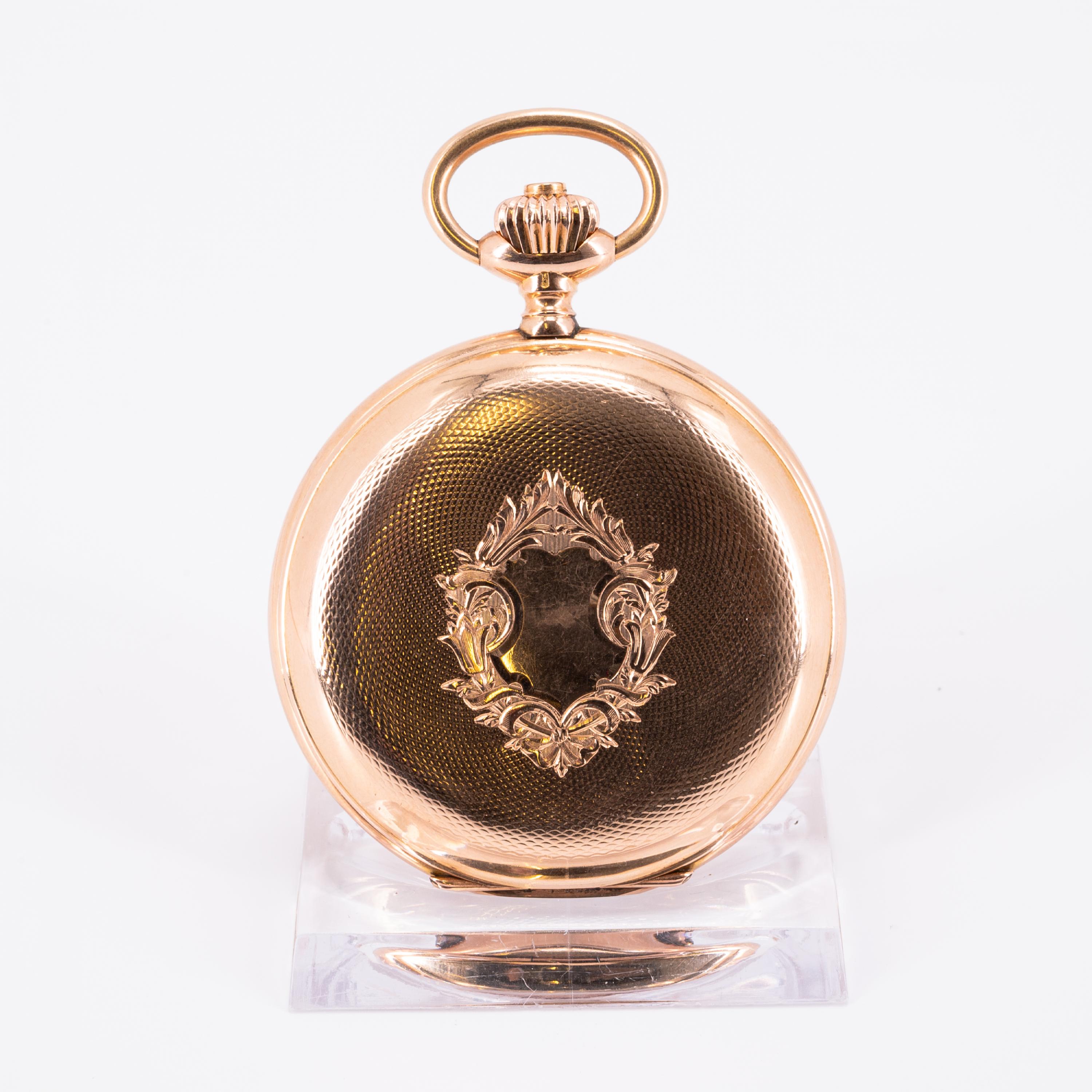 Gehäuse/Armband: 585/- Roségold, Staubdeckel, vergoldet, Email-Zffbl. weiß, arabische Ziffern schwarz, Zeiger golden.