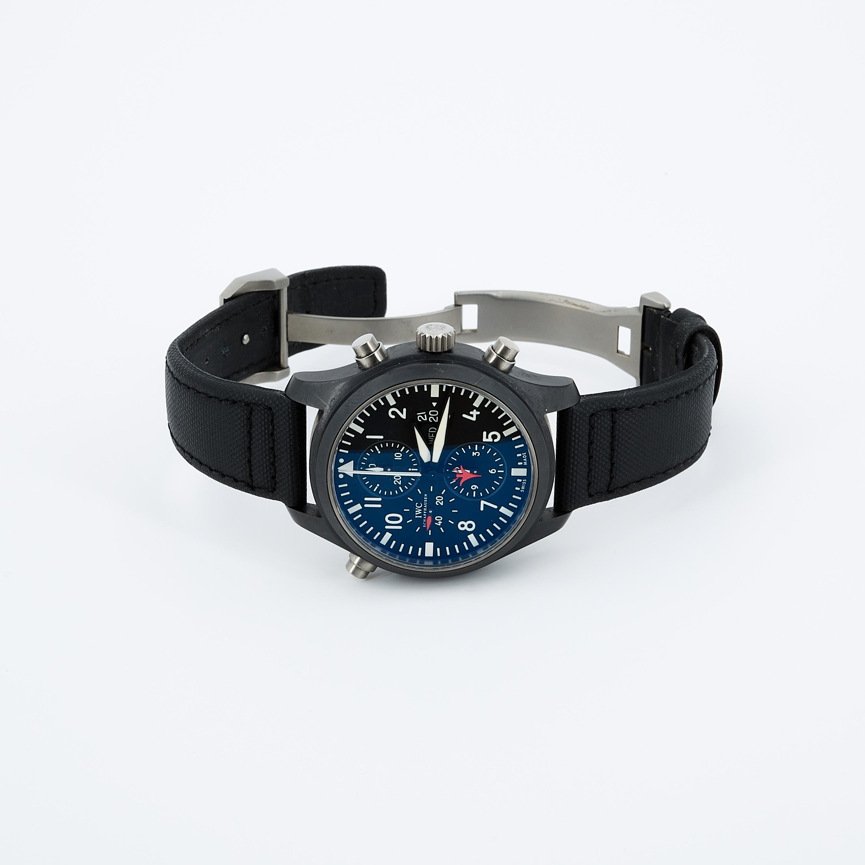Beschreibung: 3-Zeiger-Doppelchronograph mit Datumsanzeige und Wochentagsanzeige bei "3" Uhr,