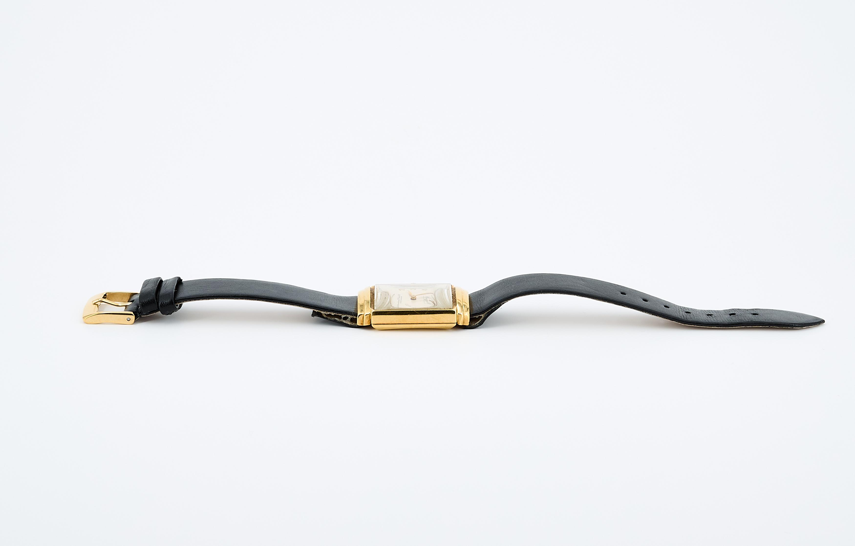 Gehäuse/Armband: 750/- Gelbgold, Lederarmband mit Dornschließe, Zffbl. silbern, Zeiger und arabische Ziffern golden.