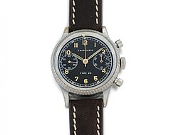 Beschreibung: 3-Zeiger-Chronograph mit 30-Minutenzähler bei "3" Uhr und dezentraler Sekunde bei "9" Uhr.