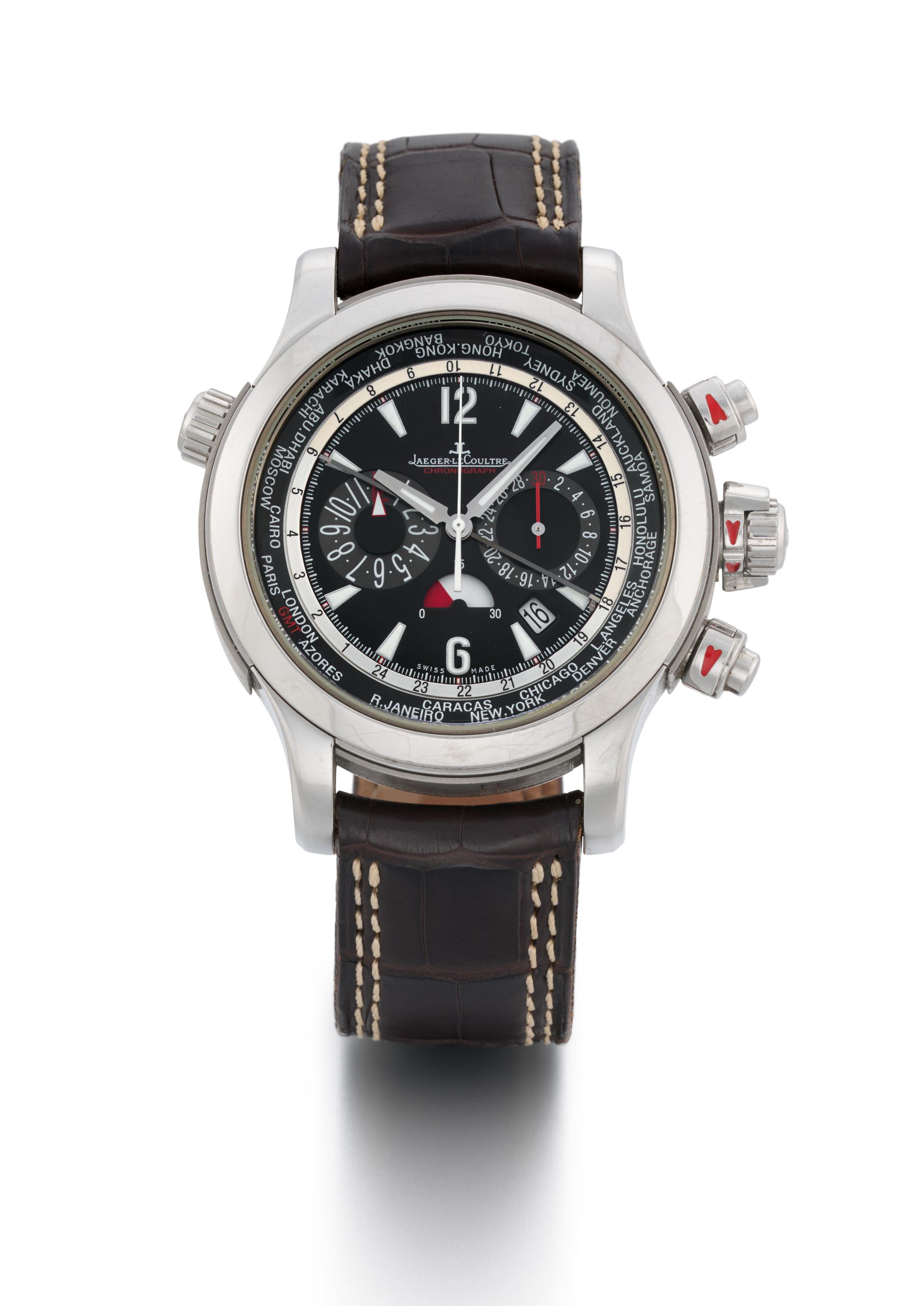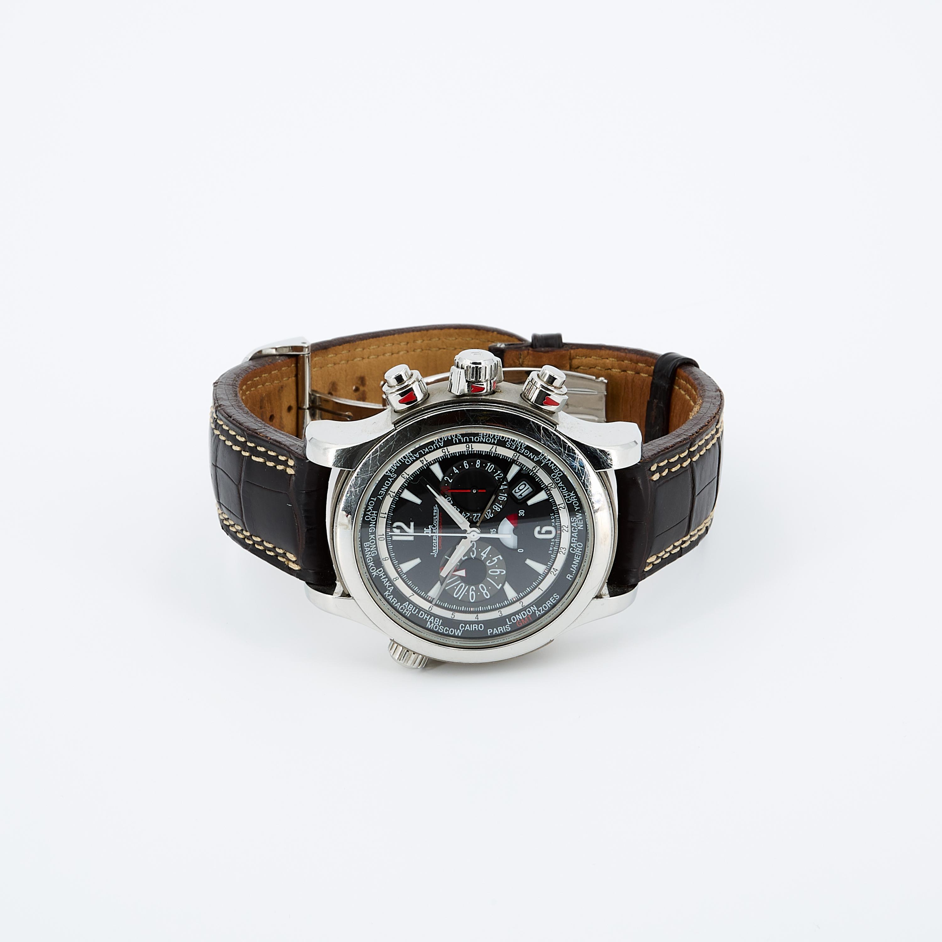 Beschreibung: 3-Zeiger-Chronograph und Weltzeituhr mit Zeigerdatum bei "3" Uhr, dezentraler Sekunde bei "6" Uhr, 12-Stundenzähler bei "9" Uhr.