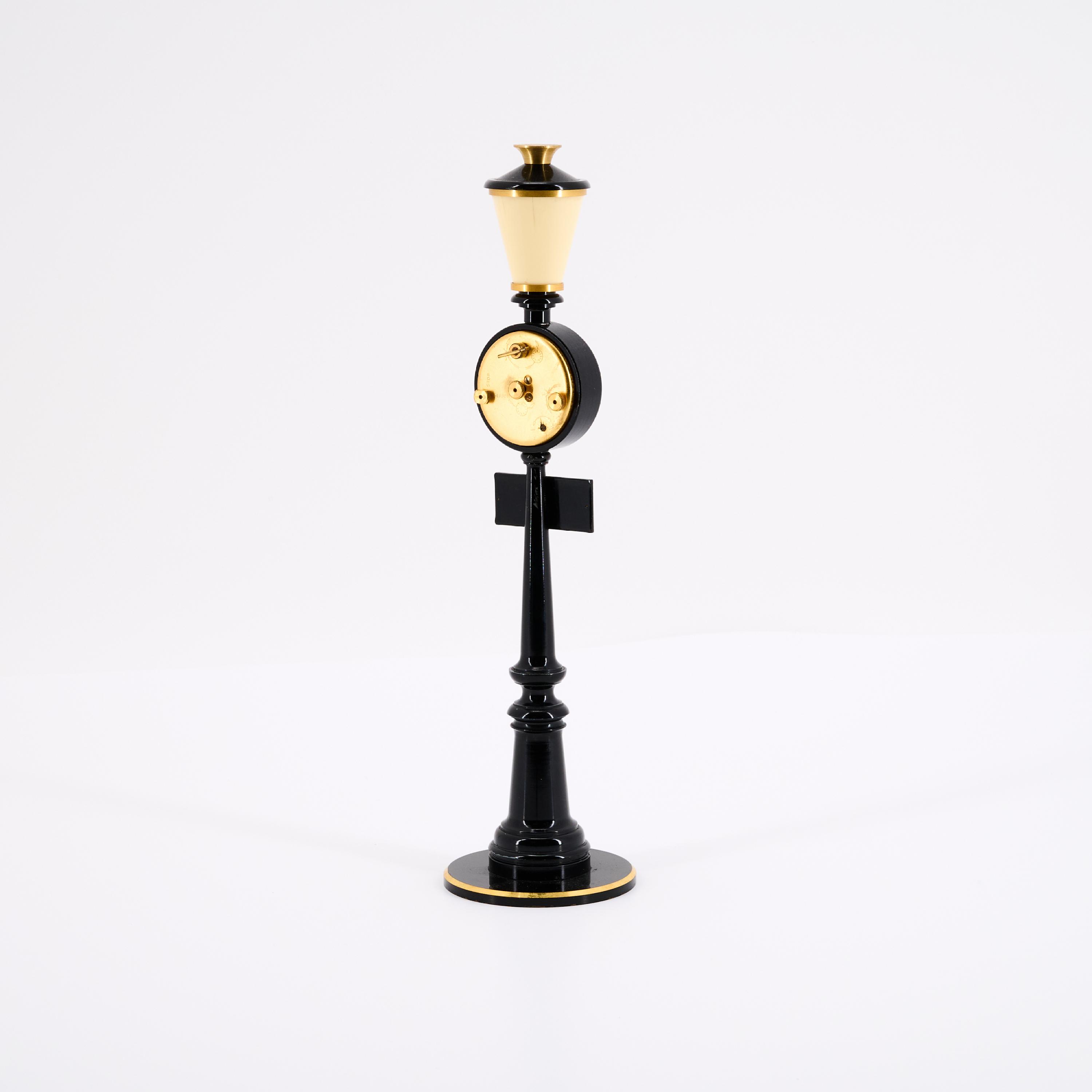 Beschreibung: Gehäuse in Form einer Straßenlaterne. Zifferblatt mit römischen Ziffern und über der IV