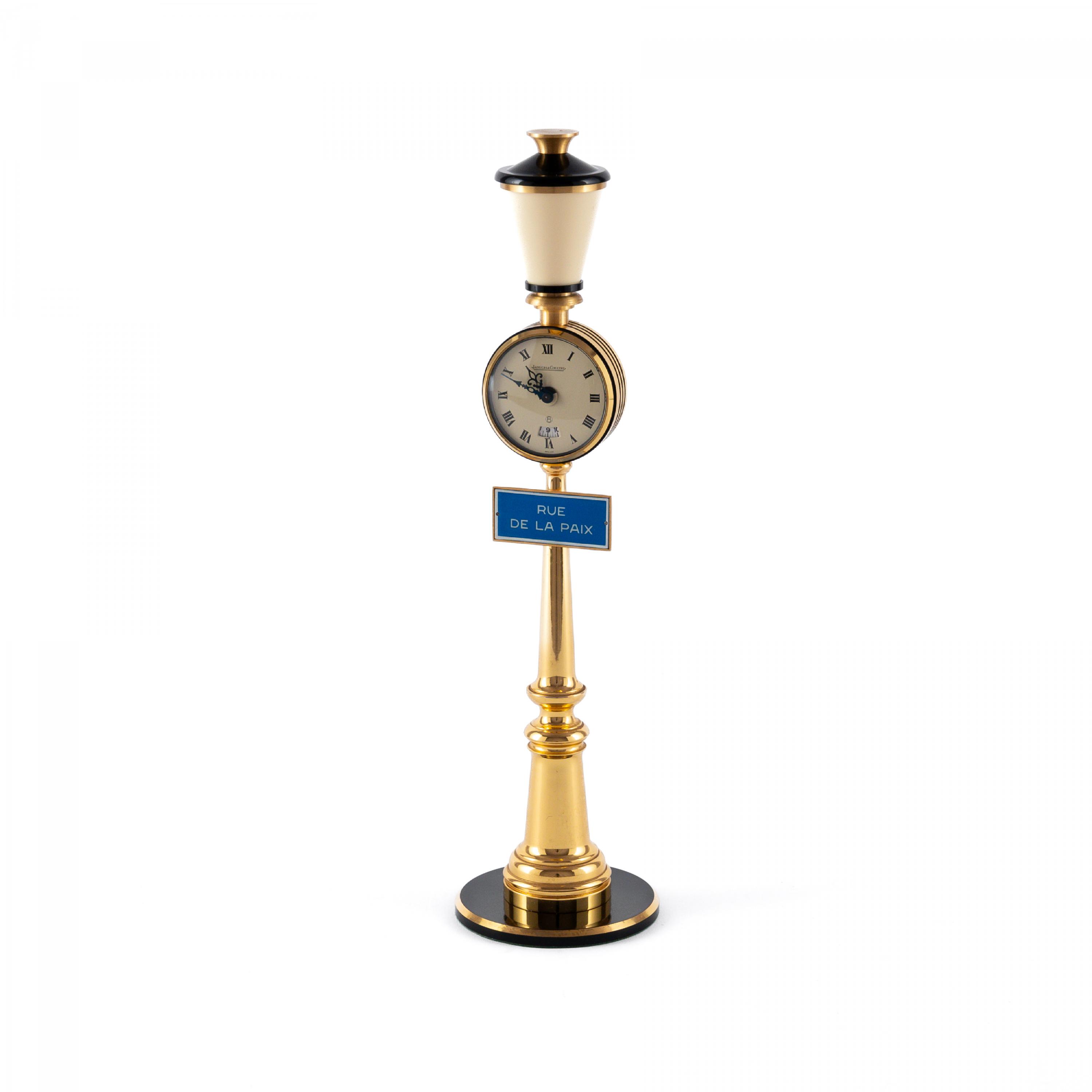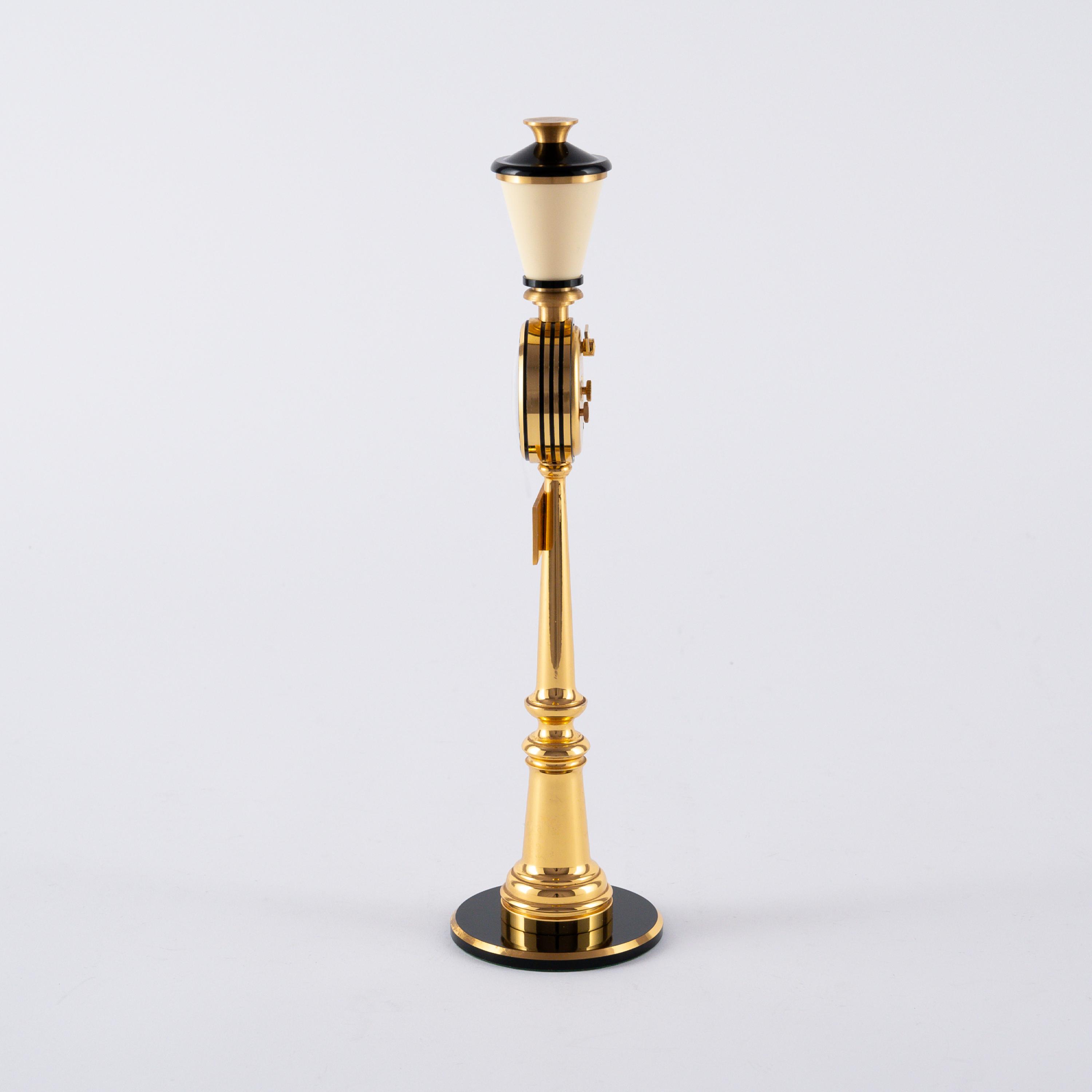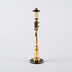 Beschreibung: Gehäuse in Form einer Straßenlaterne. Zifferblatt mit römischen Ziffern und über der IV