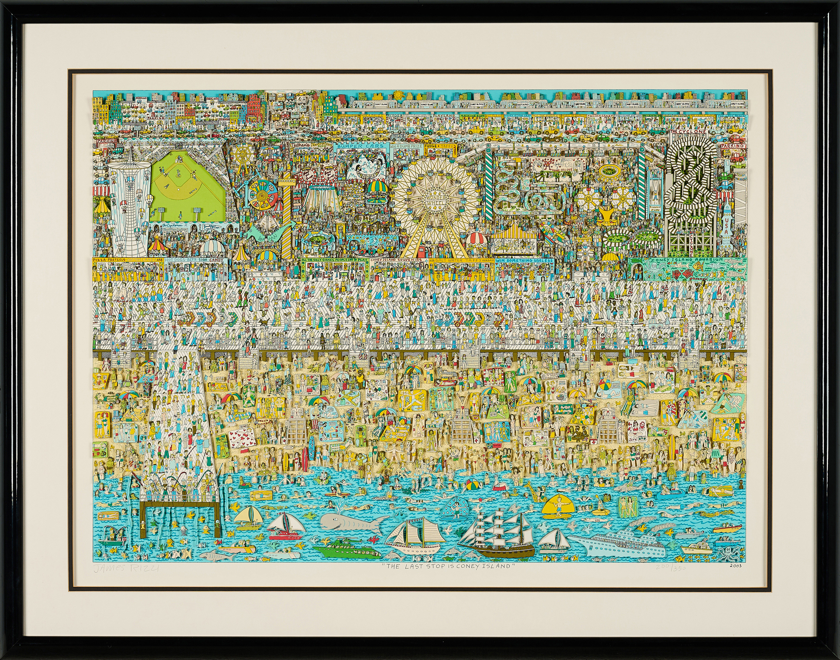 Vereinzelt sind Farben minimal verblasst, z.B. die Rottöne im Badetuch der Frau links unten und im Stand oben mittig ("Win a Dumb Prize"). Verso montiert. Ansonsten sehr guter Zustand. Im Rahmen beschrieben.