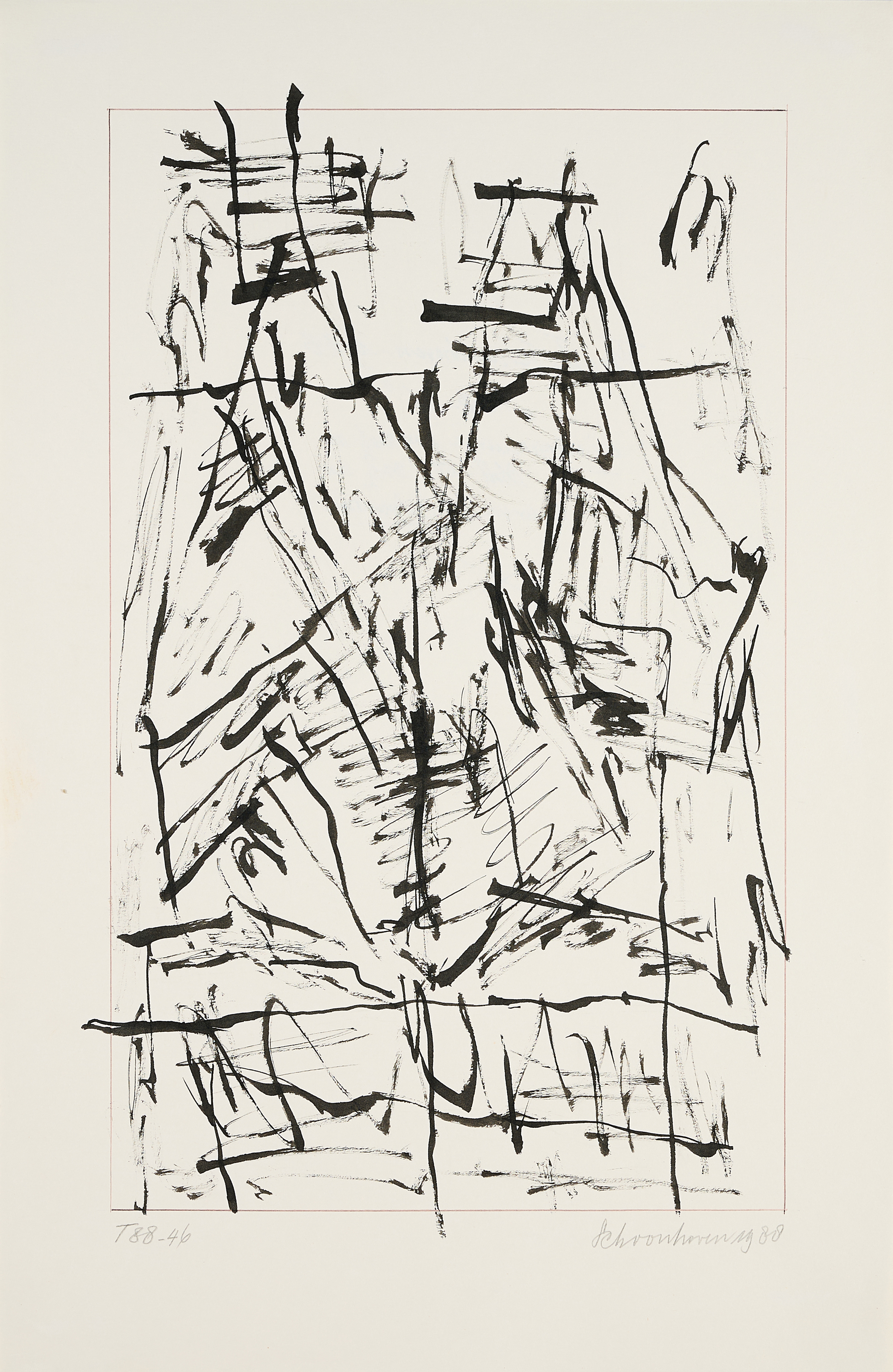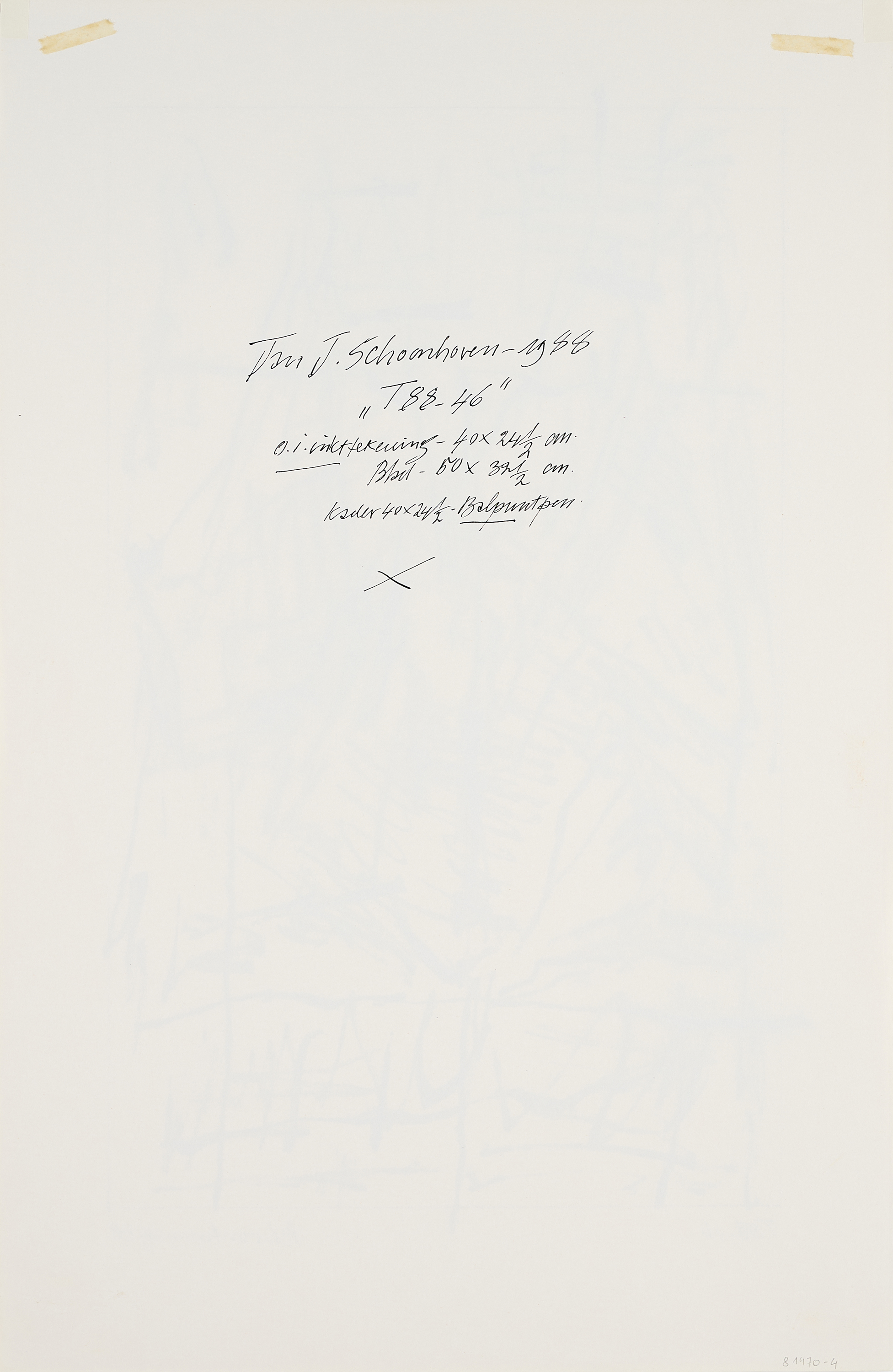 Bezeichnung: Signiert und datiert unten rechts: Schoonhoven 88. Sowie betitelt unten links: T 88-46. Sowie signiert, datiert und betitelt verso: Jan J. Schoonhoven - 1988 "T88-46" . Hier zudem mit Werkangaben.