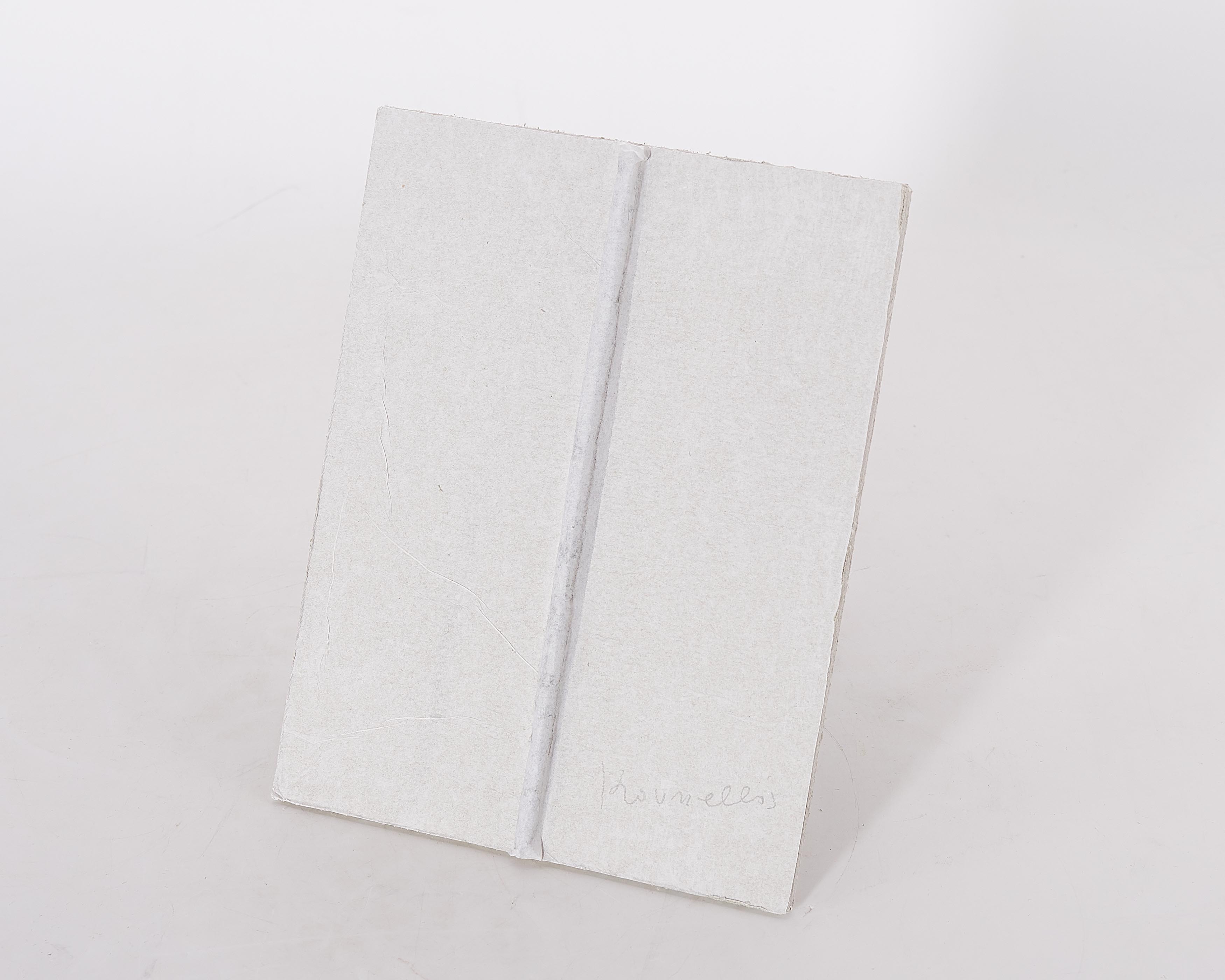 Technik: Assemblage aus Schwarzpulver-Kerze auf Asbest-Platte, mit weißem Bezugspapier überklebt. Lose eingelegt in Pappkassette mit 1 Titelblatt und 3 Textblättern.