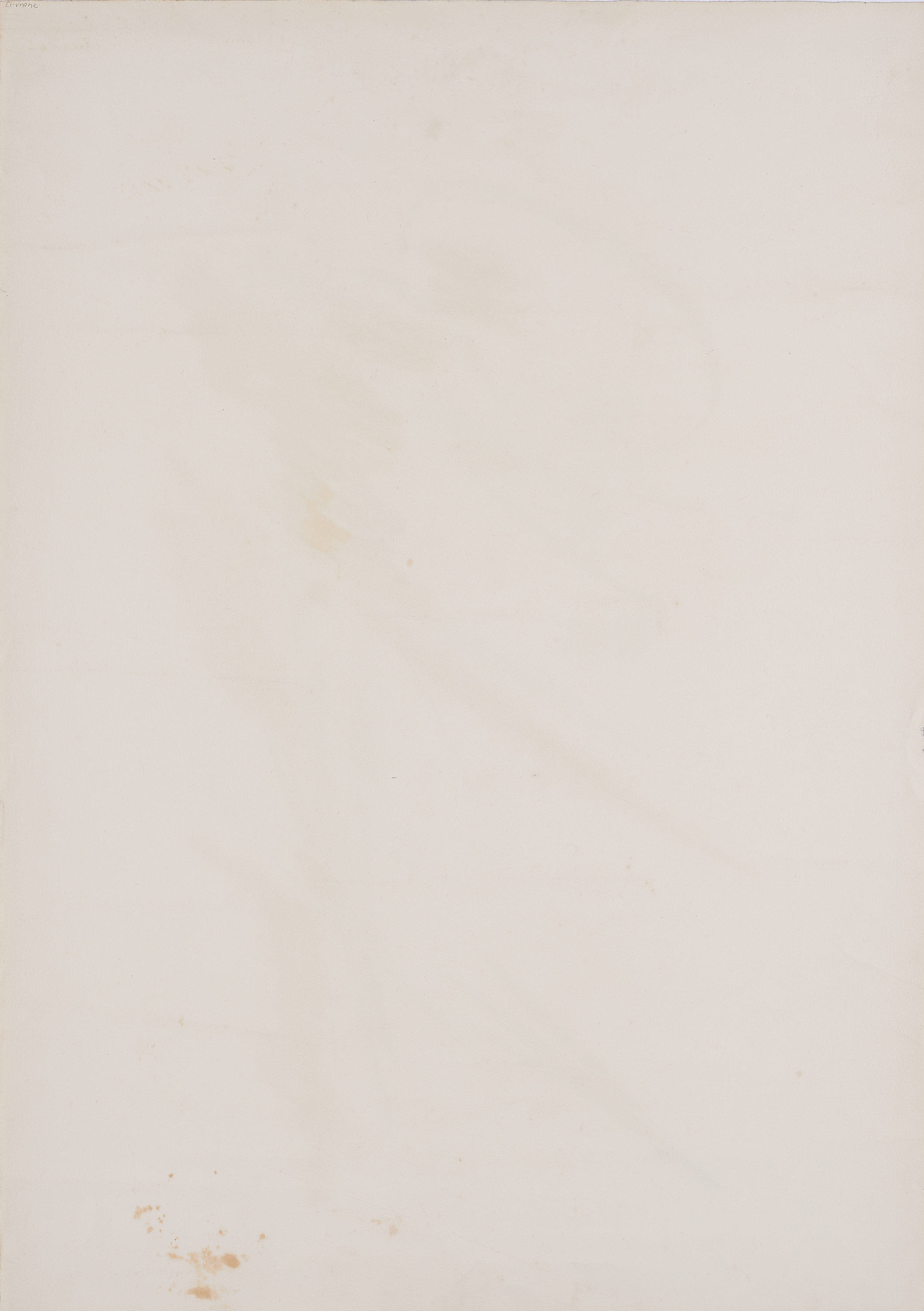 Blatt stockfleckig, insbesondere am oberen und unteren Randbereich. Leichte Griffspuren. Minimale Knickspuren, bedingt durch ehemalige Rollung. Ausradierte Bleistiftspuren am unteren Randbereich mittig. Ansonsten befindet sich das Blatt in einem guten Zustand.