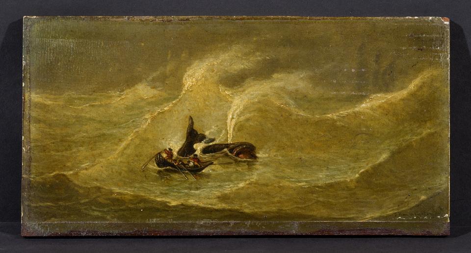 Der Walfisch. Signiert unten rechts: J. van de Kerkhove. Öl auf Holz. 11 x 21,5cm. Rahmen.