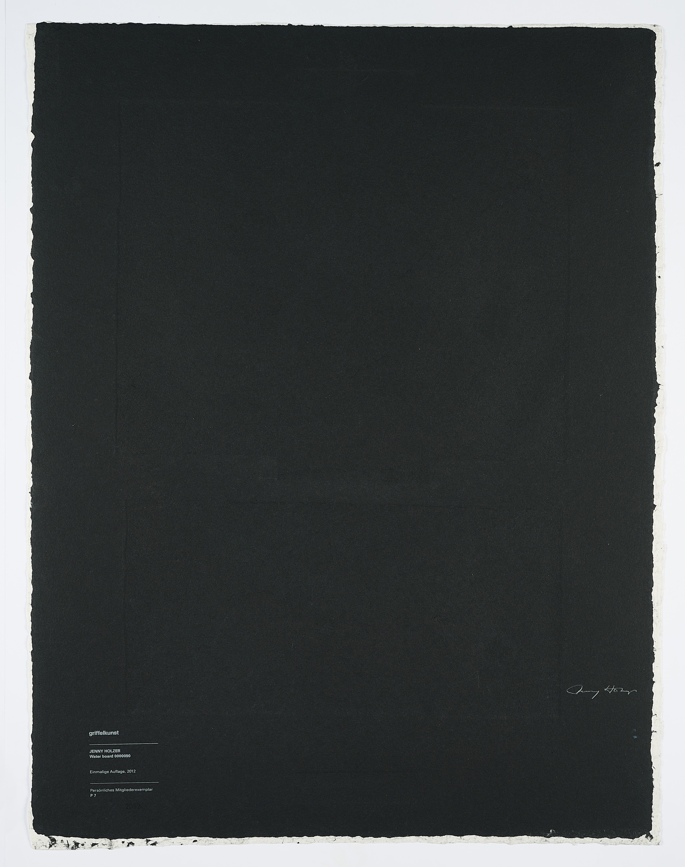 Jeweils verso mit typografischen Angaben zu Werk und Herausgeber. Die Künstlerin prangert hier einen Skandal an, der aus Medienberichten bekannt geworden ist, dass amerikanische Soldaten während der Golfkriege die international geächtete Foltermethode des "Waterboarding" angewendet hatte. Für die Arbeiten verwendete Jenny Holzer die freigegebenen, vergrößerten Originaldokumente der CIA, in denen die Foltermethode aktenkundig wird. Holzer schwärzte die Textblöcke bis auf Schlüsselwörter. Die Arbeit wurde extrem aufwendig hergestellt, da jedes Motiv aus zwei verschiedenen Papiersorten geschöpft wurde. Selbst die Schrift ist nicht gedruckt, sondern in Form geschöpft. Daher ist jedes Werk ein Unikat.