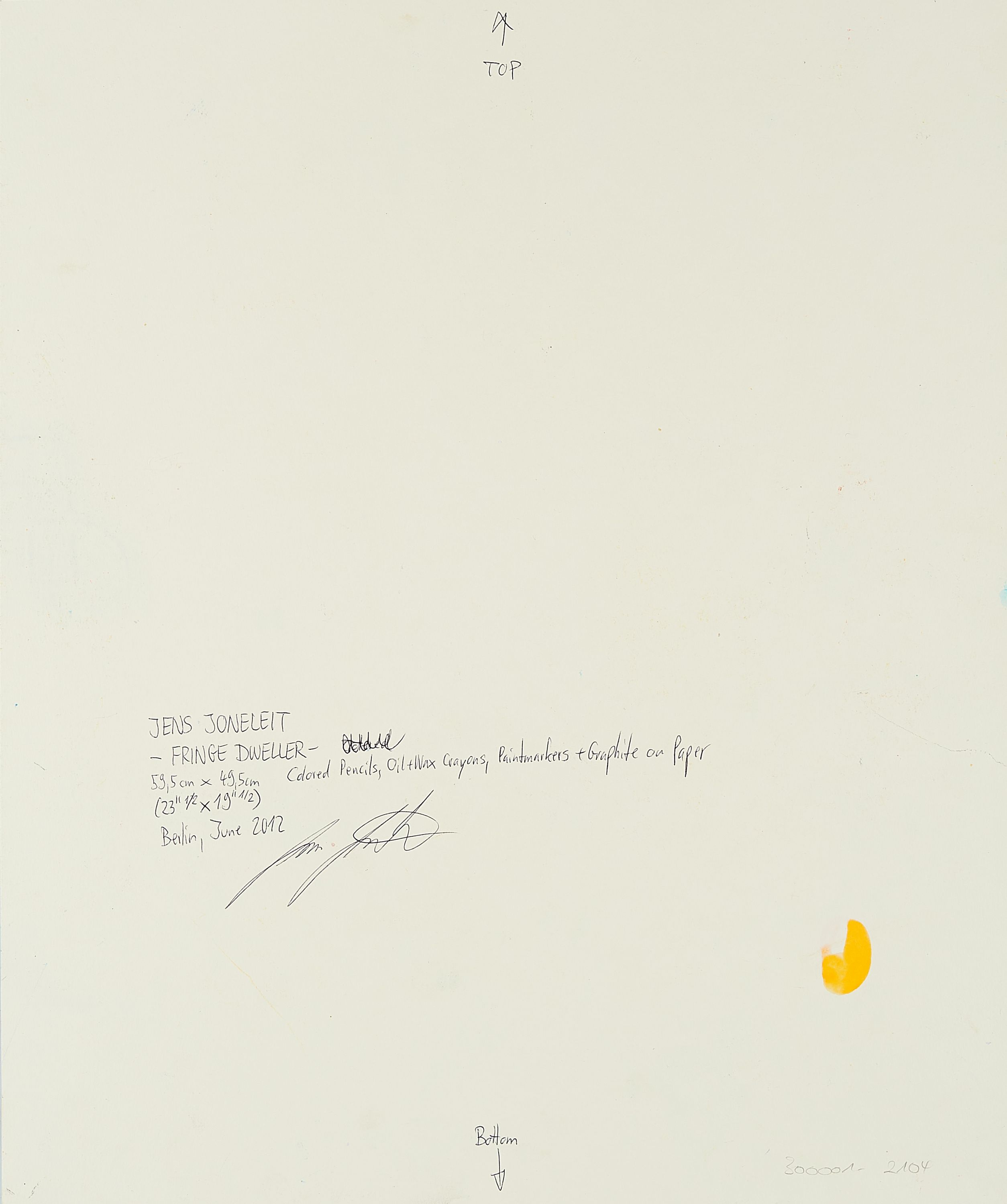 Bezeichnung: Signiert, datiert, betitelt und bezeichnet verso: JENS JONELEIT -FRINGE DWELLER- 59,5 cm x 49,5 cm (23 1/2 x 19 1/2) Colored Pencils, Oil+Wax Crayons, Paintmarkers - Graphite on Paper Berlin, June 2012 Jens Joneleit.