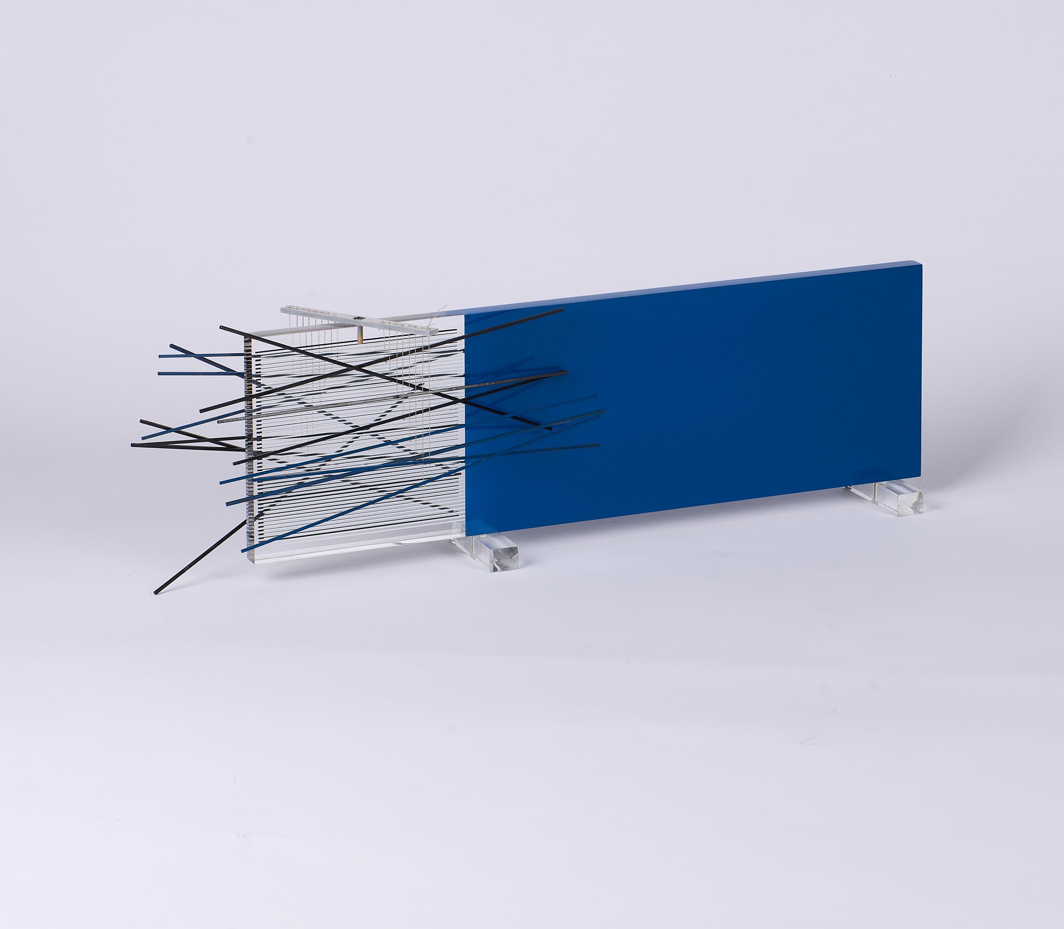 Technik: Farbserigrafie auf transparenter Plexiglasplatte, davor schwarz und blau gefasste Metallstäbe an Nylonfäden.