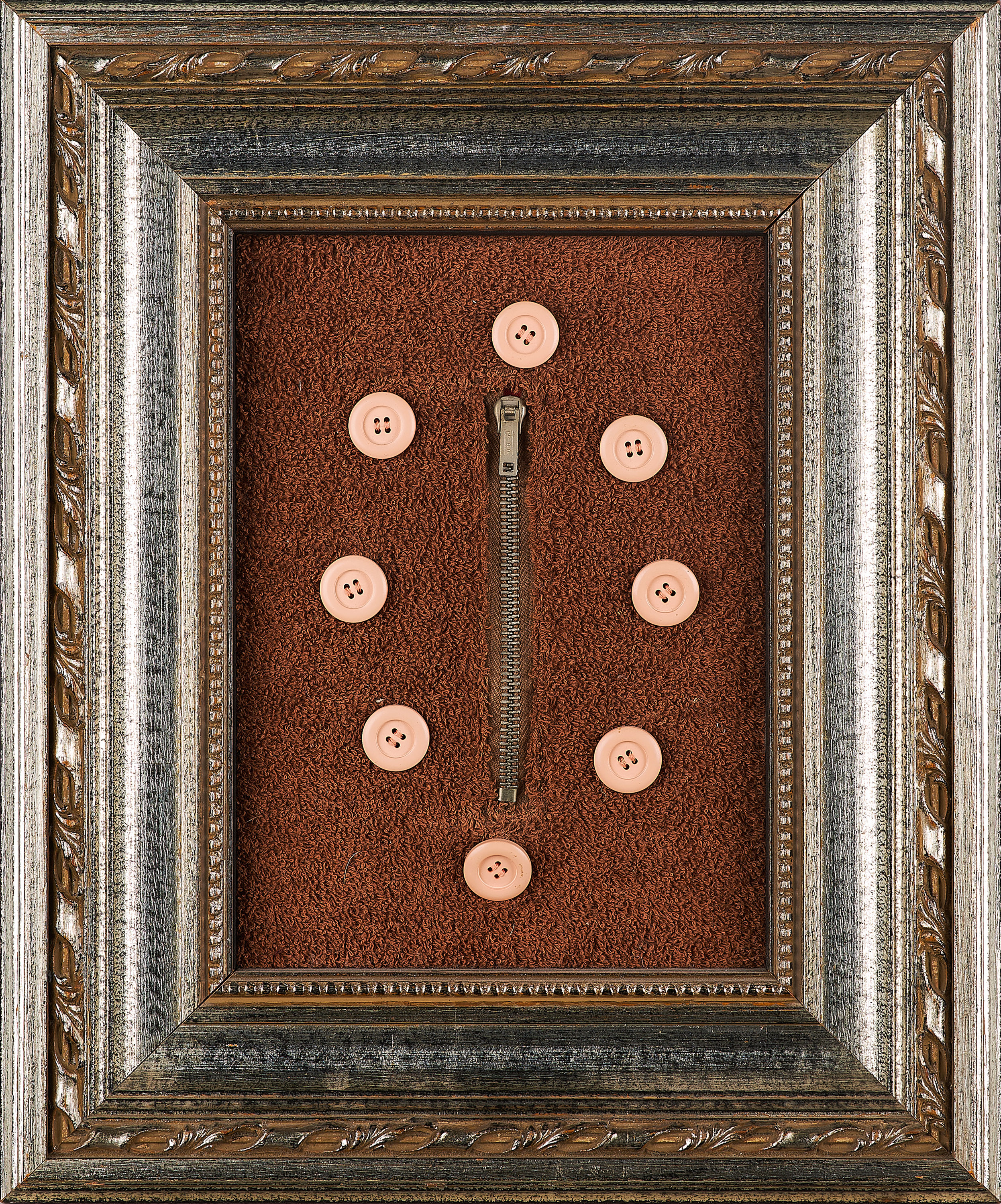Technik: Künstlerbuch, bespannt mit Frottee, benäht mit Knöpfen und einem Reißverschluss. In Rahmen montiert.