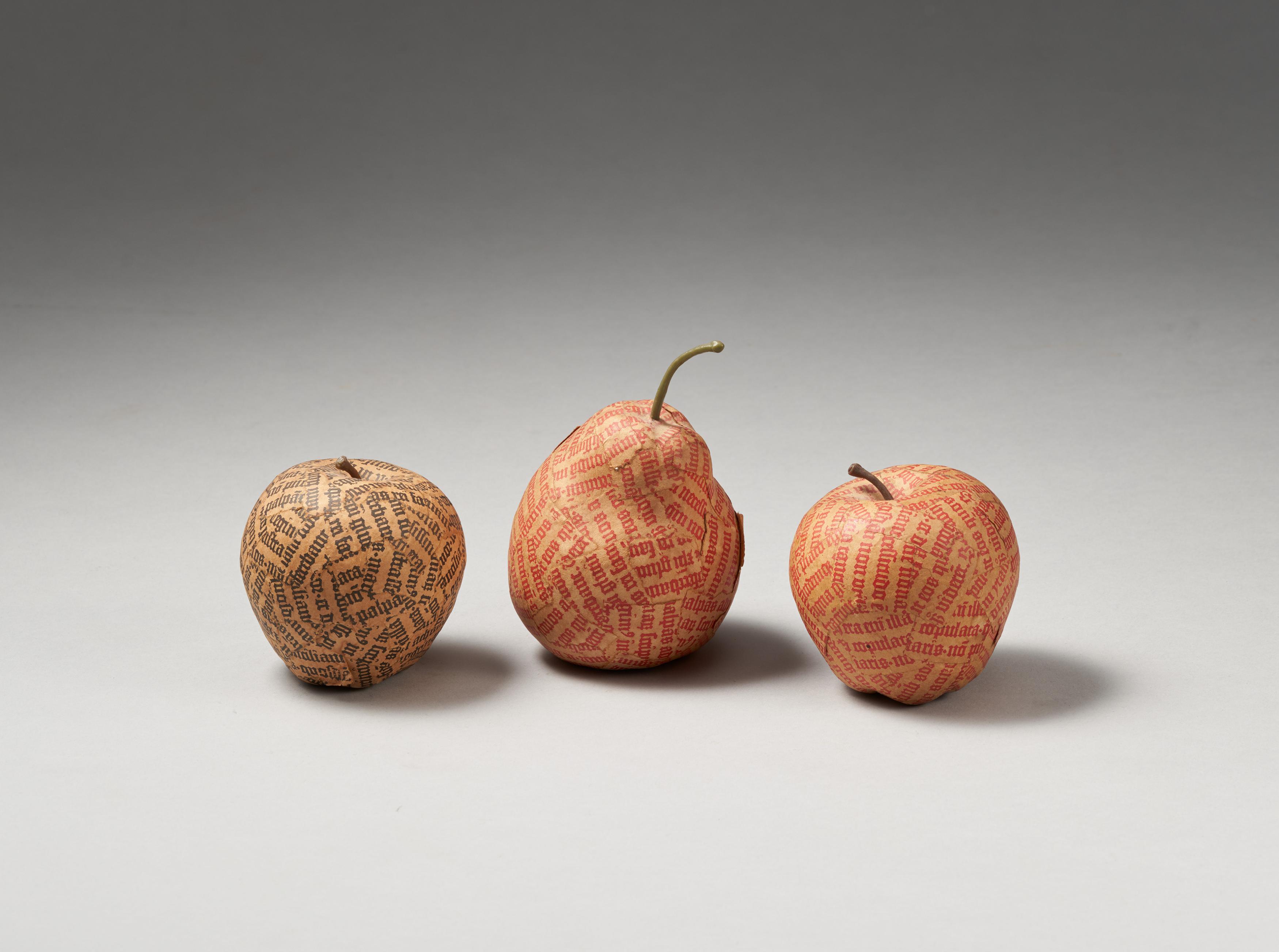 Jeweils: Papiercollage auf Kunststofffrucht. Birne: 12 x Ø 8cm. Äpfel jeweils: 6,5 x Ø