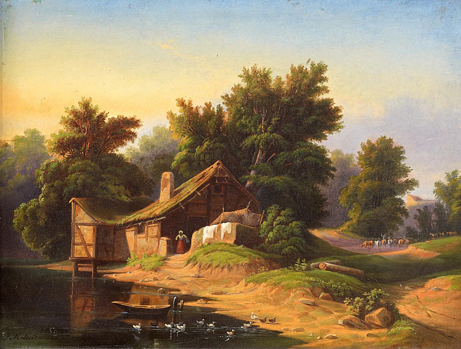 Bauerngehöft am Weiher. Unten Links: J.M. Leitzmann. Öl auf Leinwand. Auf Hartfaser aufgezogen. 26 x 34,5cm. Rahmen.