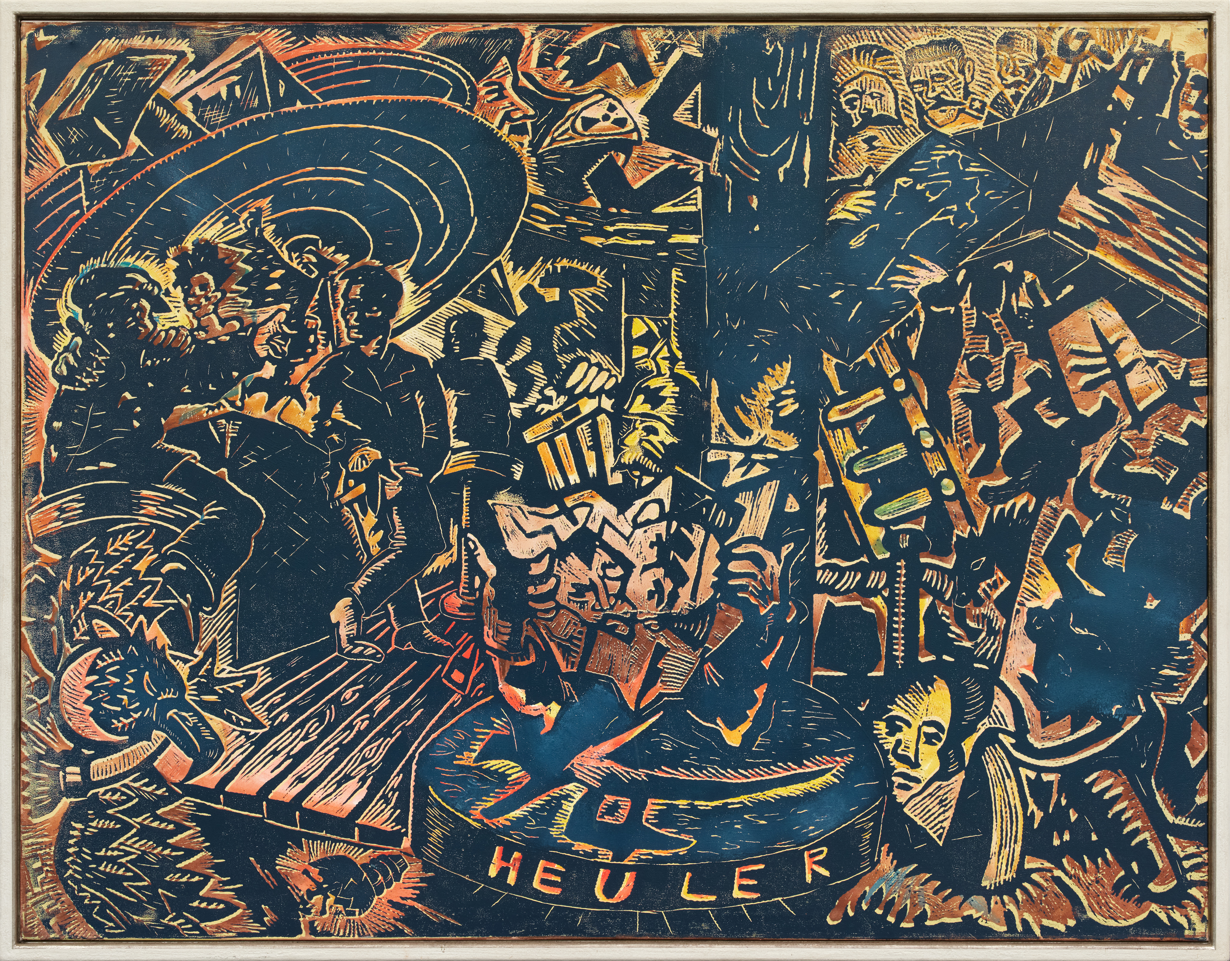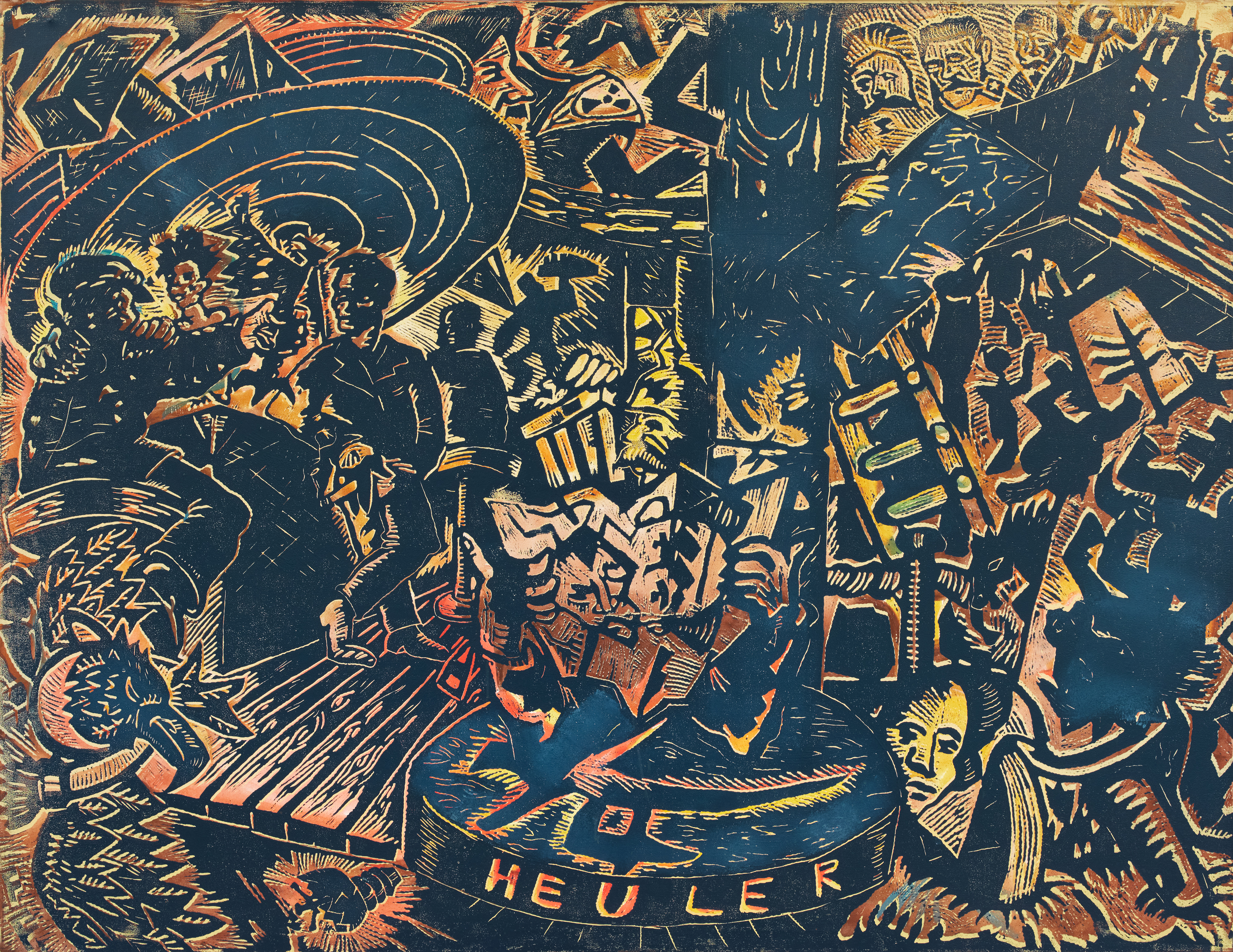 Technik: Farblinolschnitt auf Leinwand.