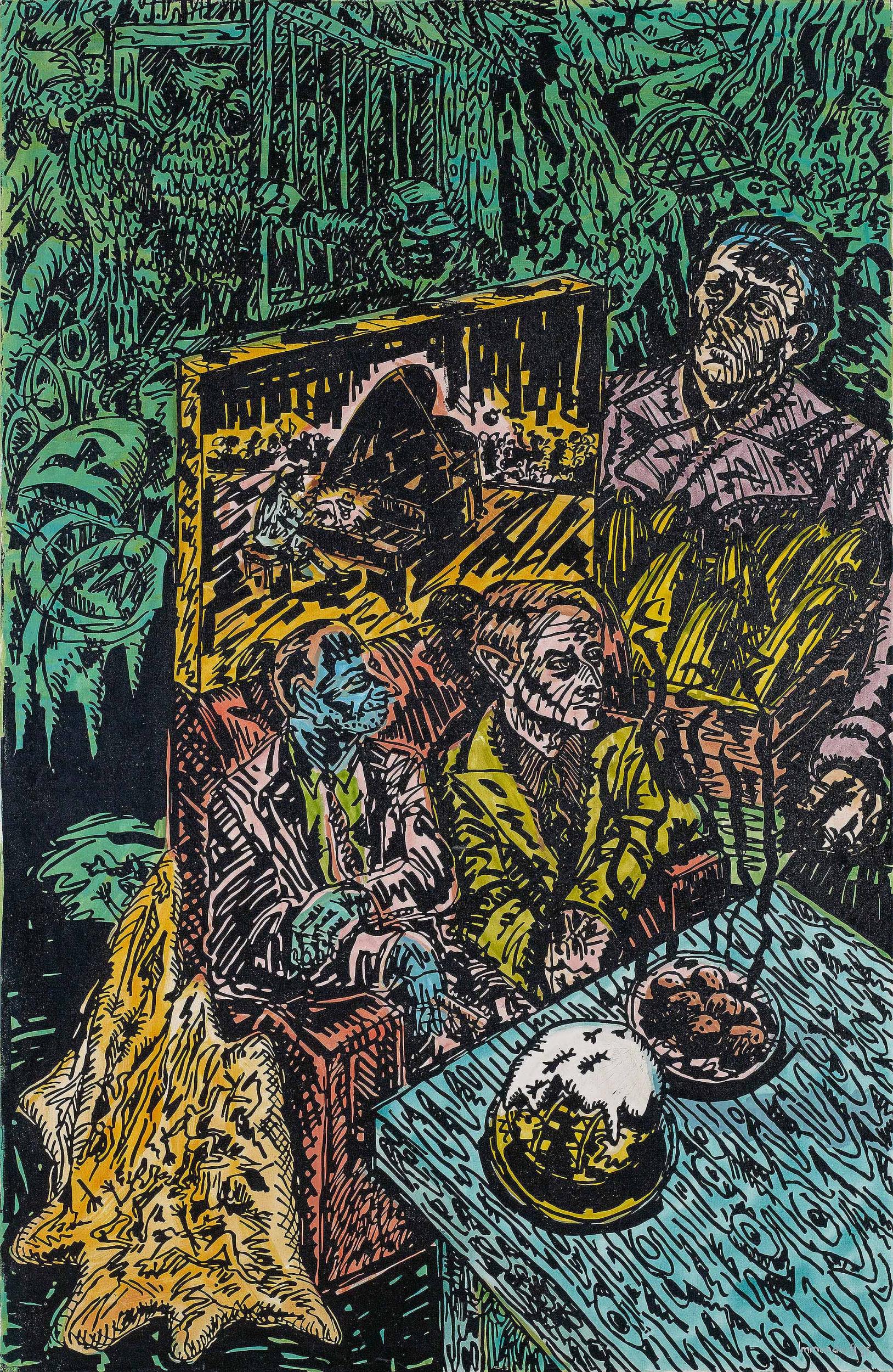 Technik: Linolschnitt und Acryl auf Leinwand.