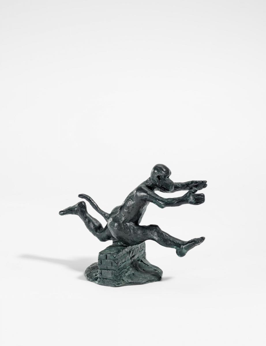 Affe als Mauerspringer. Bronze, schwarz-grün patiniert. 11,5 x 8,5 x 17cm. Stempelsignatur und -nummerierung auf dem hinteren Bereich der Plinthe: Immendorff 5/12. Daneben Gießerstempel SCHMÄKE DÜSSELDORF. Ex. 5/12.