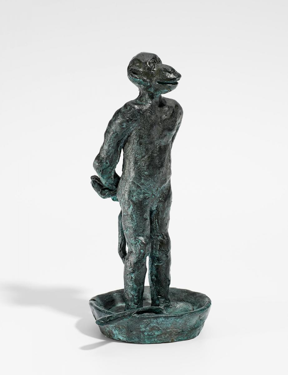 Affe mit Suppenschüssel. Bronze, grün-schwarz patiniert. 17 x 10 x 7,5cm. Stempelsignatur und -nummerierung hinten am Schüsselrand: Immendorff 9/12. SCHMÄKE DÜSSELDORF. Ex. 9/12.