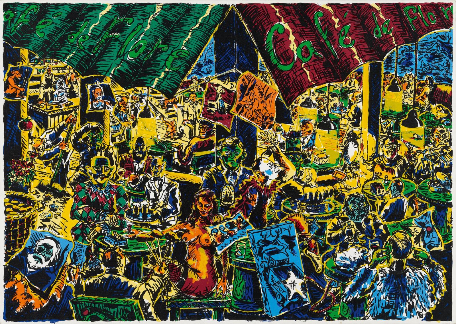 Café de Flore. 1991/1992. Farbserigrafie auf Leinwand. 96 x 135cm (98 x 137,5cm). Signiert und datiert (92). Rahmen. - Leichte Verschmutzungen bzw. Farbspuren in den Randbereichen. Verso minimale Verschmutzungen.