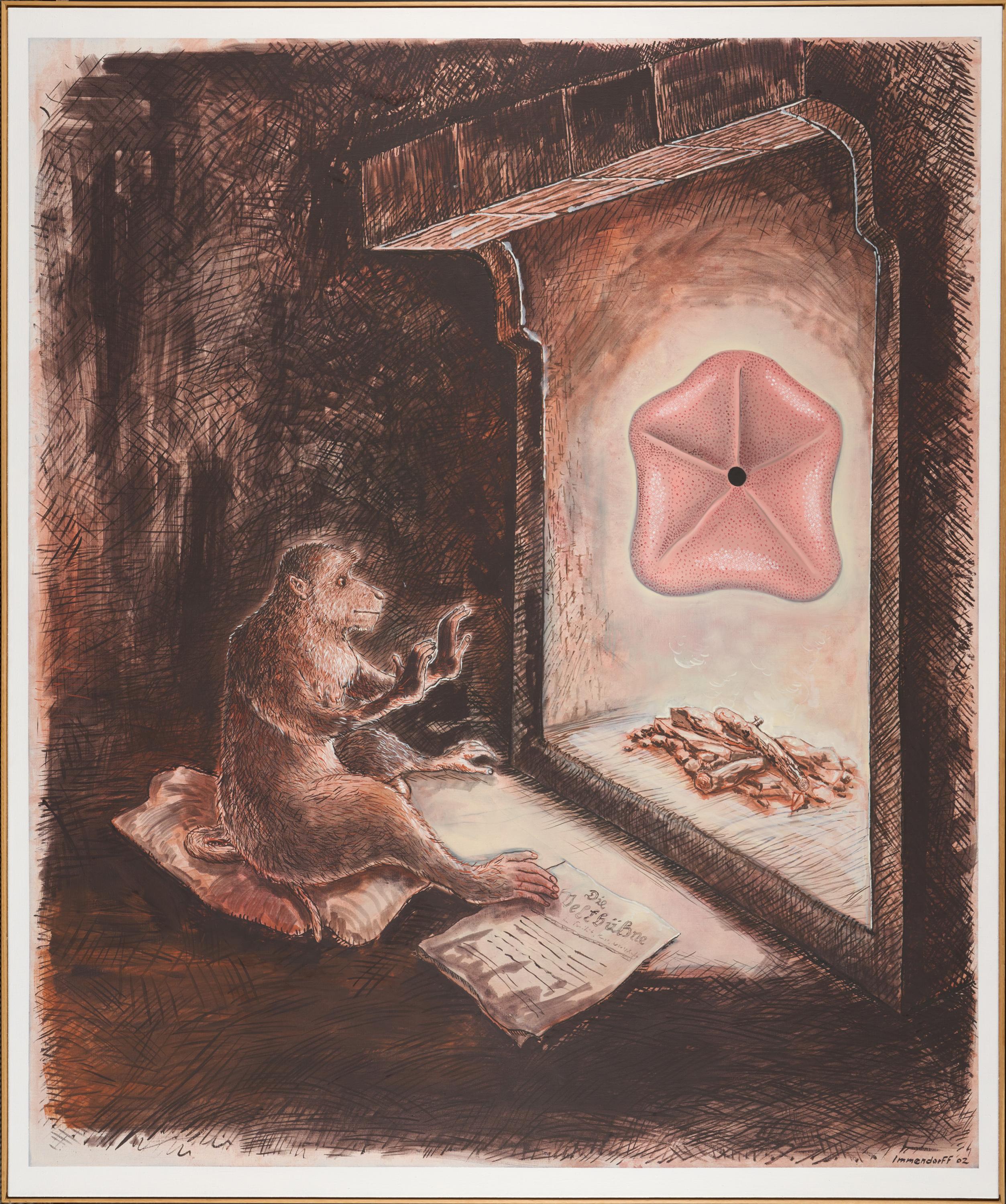 Geprägt von Selbstzweifeln, Unsicherheiten und einer ambivalenten Haltung gegenüber der eigenen Künstlerexistenz, findet das Motiv des Affen seit 1985 häufige Verwendung in den Bildern, Grafiken und Skulpturen des Beuys Schülers Immendorff. Jörg Immendorff sieht den "Maleraffen" als sein Alter Ego, das Widersprüchliches in sich vereint: Überzeugung und Selbstzweifel, Albernheit und Weisheit, künstlerische Genialität und animalische Triebhaftigkeit, genialen Dilettantismus und ironisches Spöttertum.