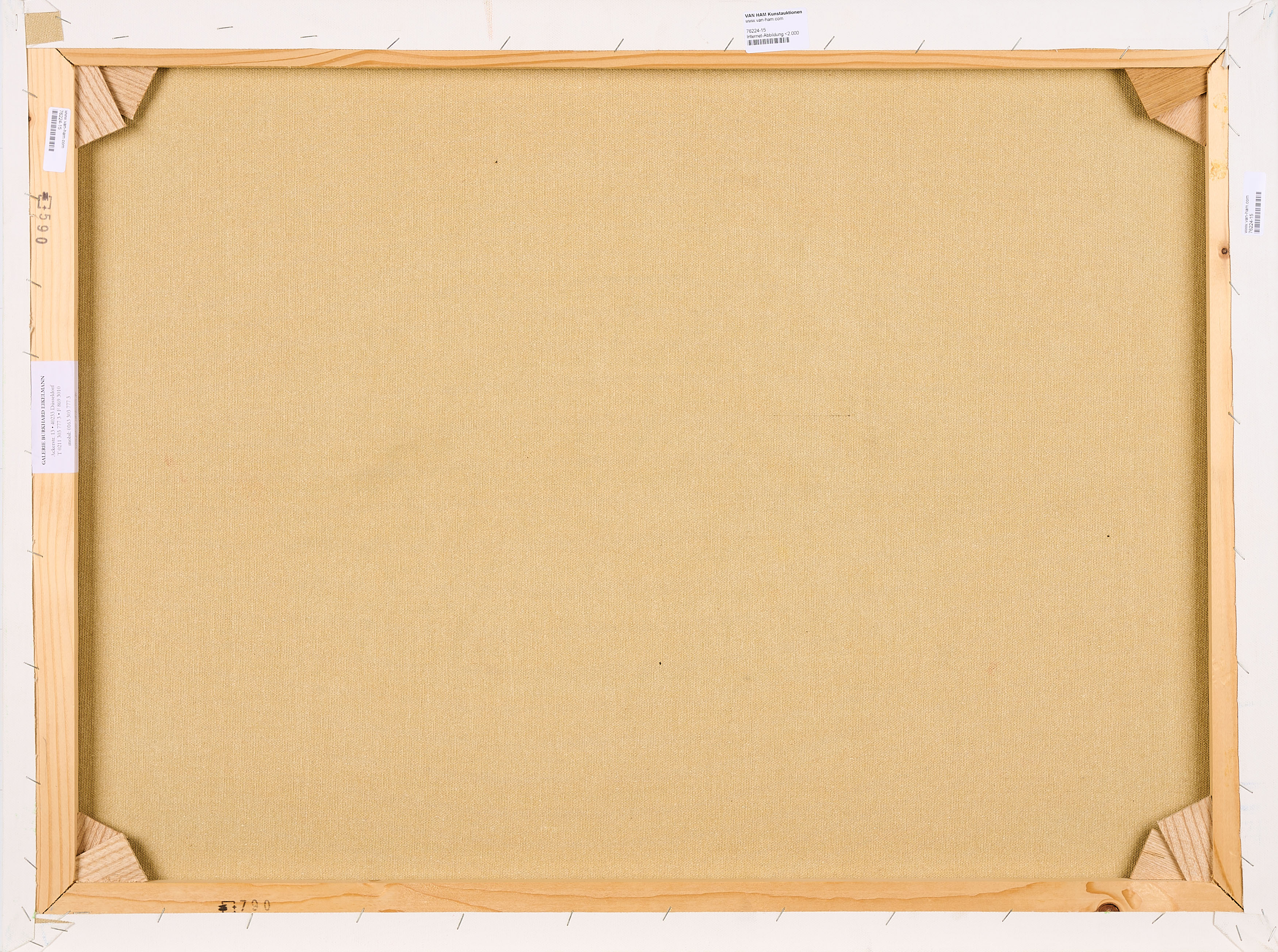 Geringe Leinwandspannung, minimales Durchdrücken des Keilrahmens. Minimale Bereibungen an den Kanten. Ansonsten sehr guter Zustand.