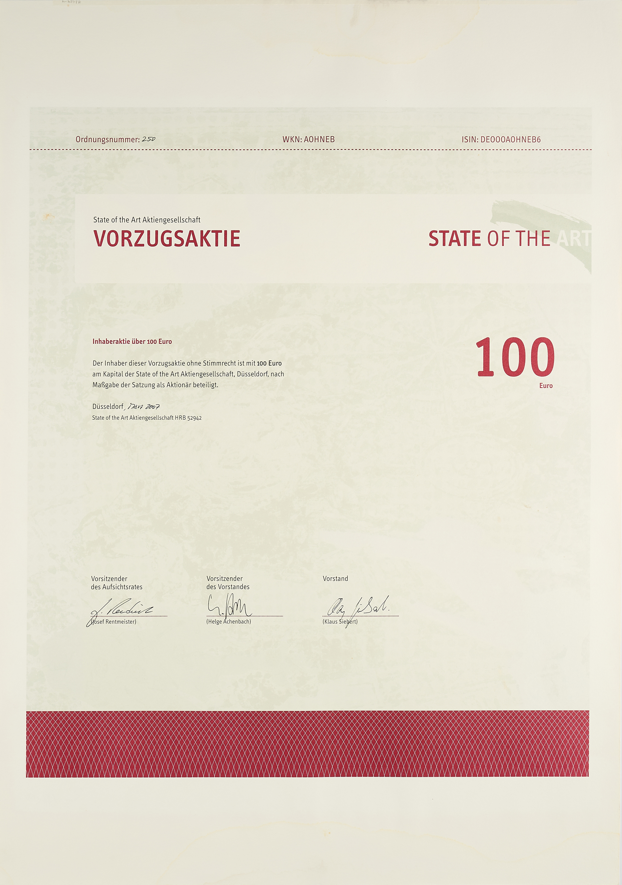 Nicht bei Geuer. Typografischer Texteindruck verso weist das Kunstwerk aus als Vorzugsaktie im Wert von 100 Euro der State of the Art Aktiengesellschaft, Düsseldorf.