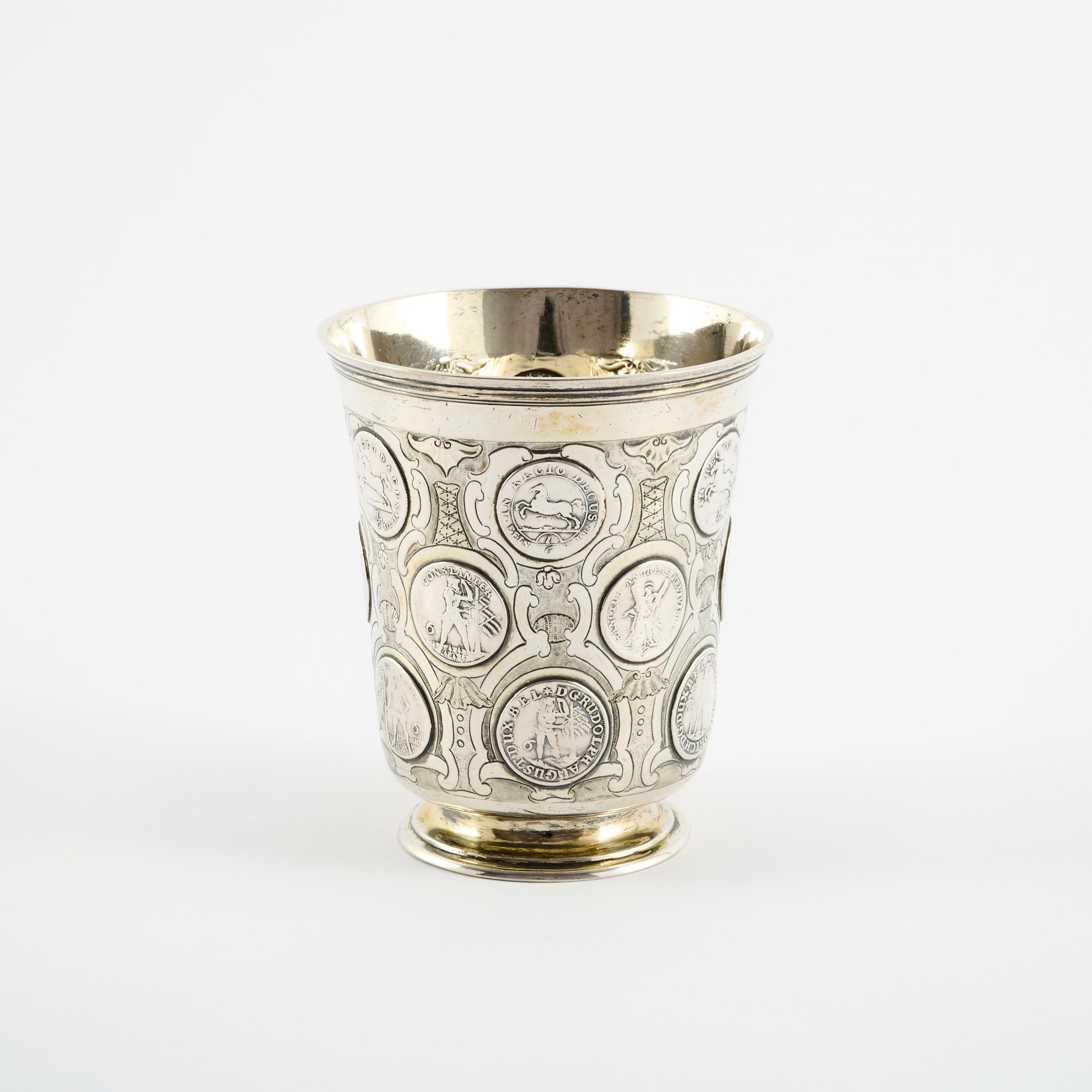 mehrfach profiliert und leicht ausgestellt. Auf der Wandung in drei Reihen 18