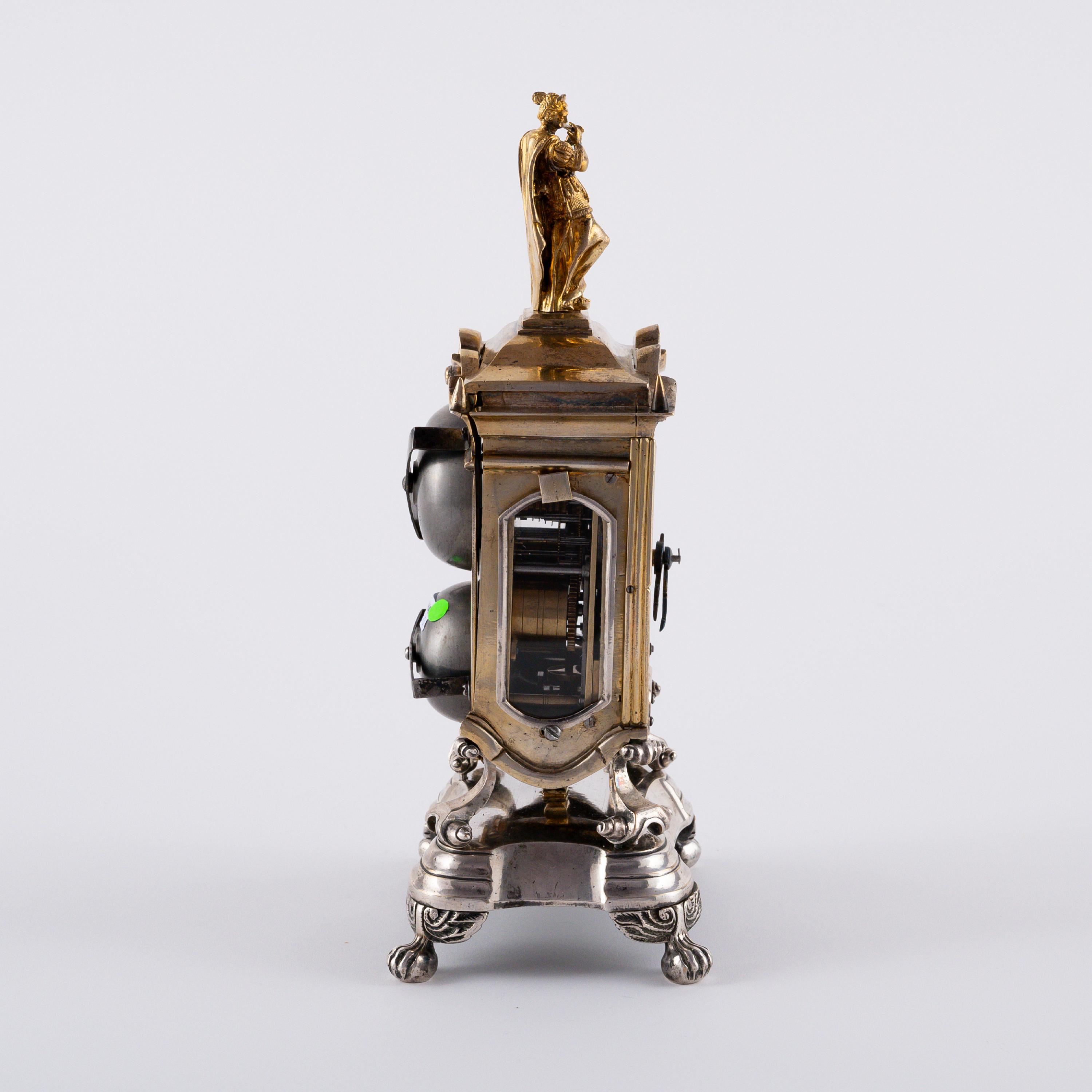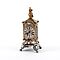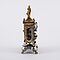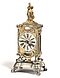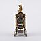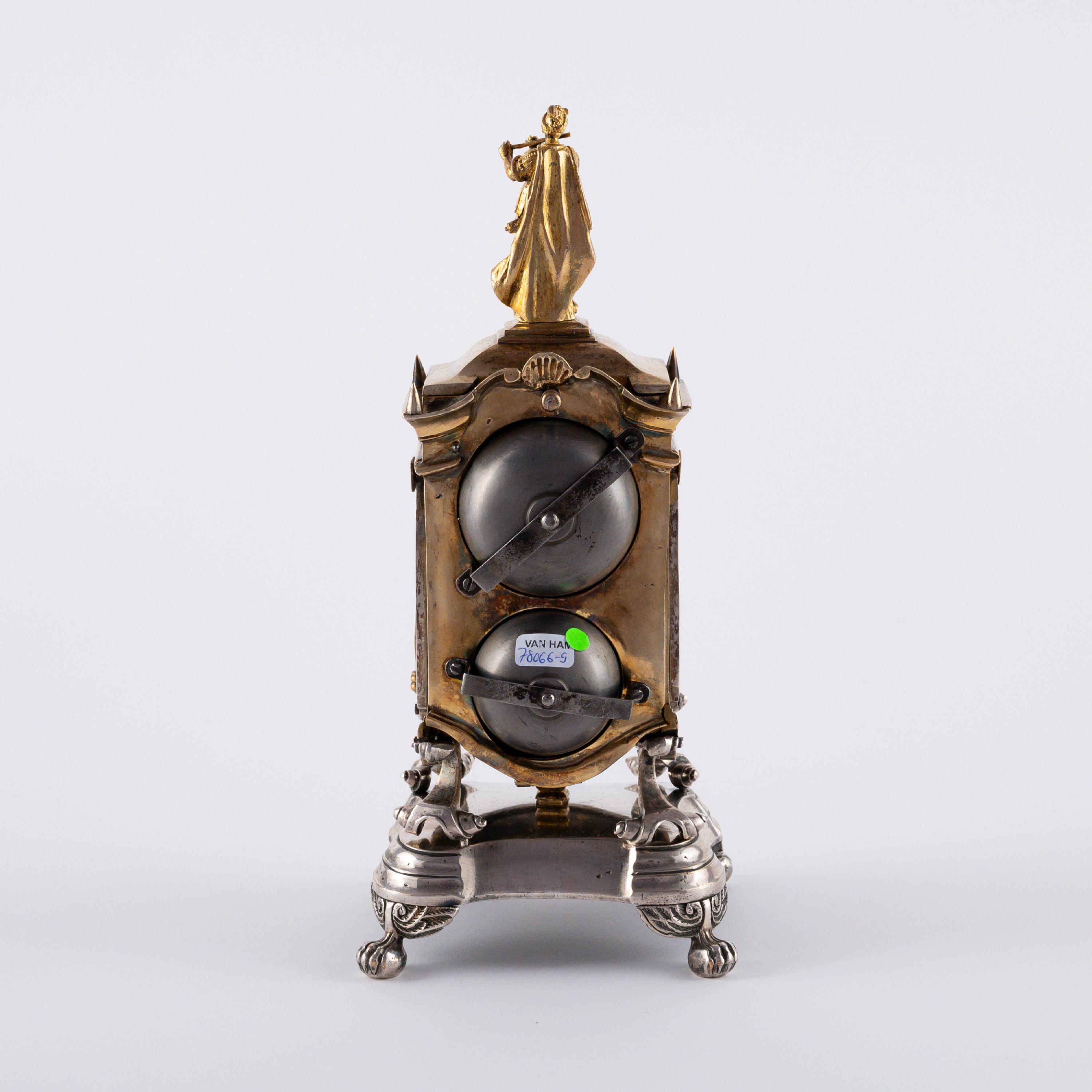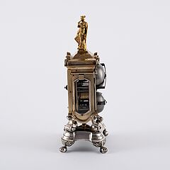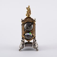 Beschreibung: Auf gekehltem rechteckigem Sockel mit Tatzenfüßen das hochrechteckige Gehäuse mit kleinem Giebel und profiliert ansteigendem Abschluss, bekrönt durch allegorische Figur mit Querflöte. Unter dem Giebel kleine Emailplakette mit ländlicher Szenerie. Das Gehäuse an den Seiten verglast, frontal unten kleine Durchfensterung mit sichtbarer Unruhe. Das versilberte Zifferblatt mit römischen Stunden und zentraler Weckerscheibe mit arabischen Stunden und zwei gebläuten Zeigern. Unten rechts Nebenzifferblatt für Wochentage auf der rechten Seite des Gehäuses der Schlagauslöser mit Zugfaden.