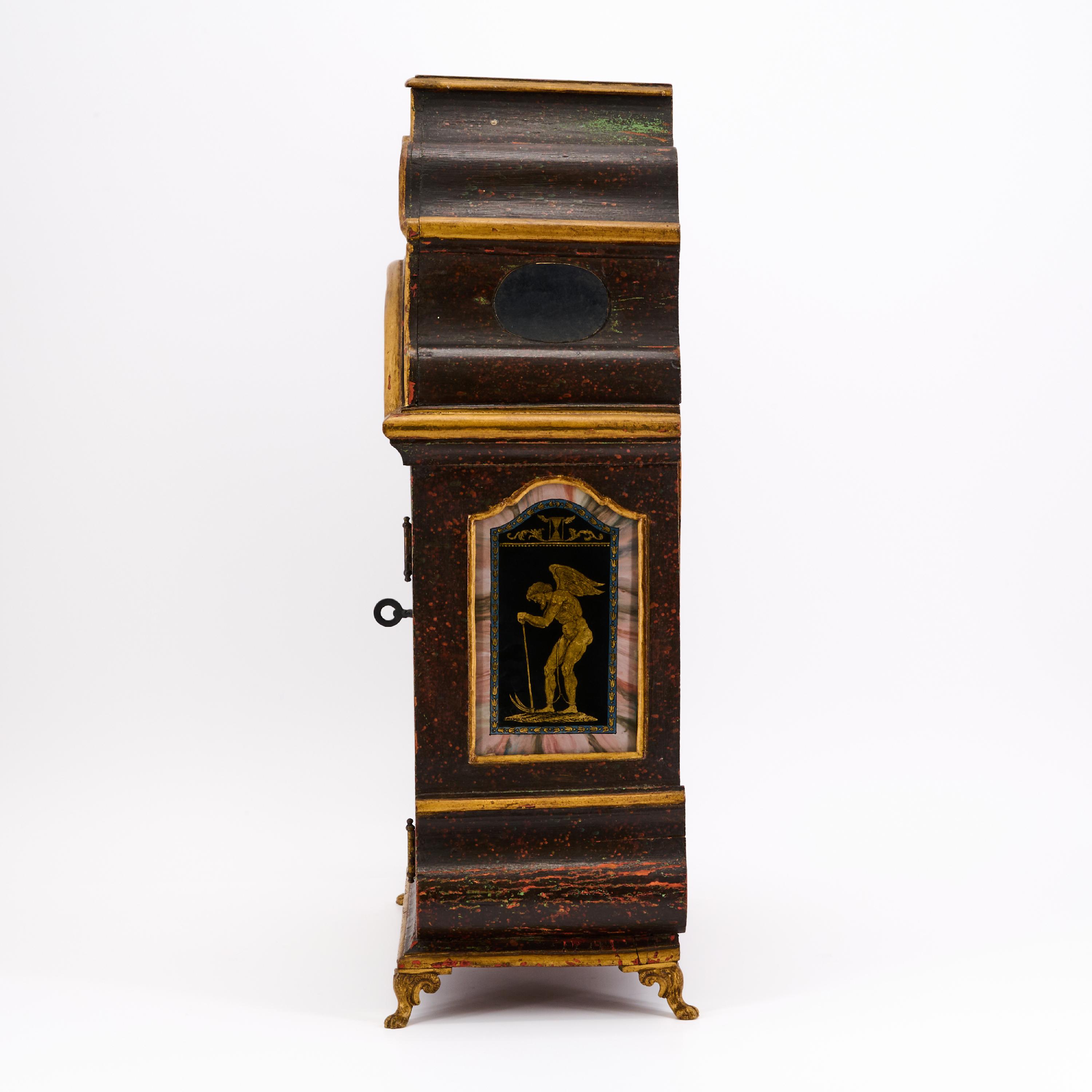 Technik: Holzgehäuse mit marmorierter Fassung. Hinterglasgemälde in Eglomisé-Technik. Vergoldetes Zifferblatt mit versilbertem Ziffernkranz. Farbig bemalter Figurenautomat.
