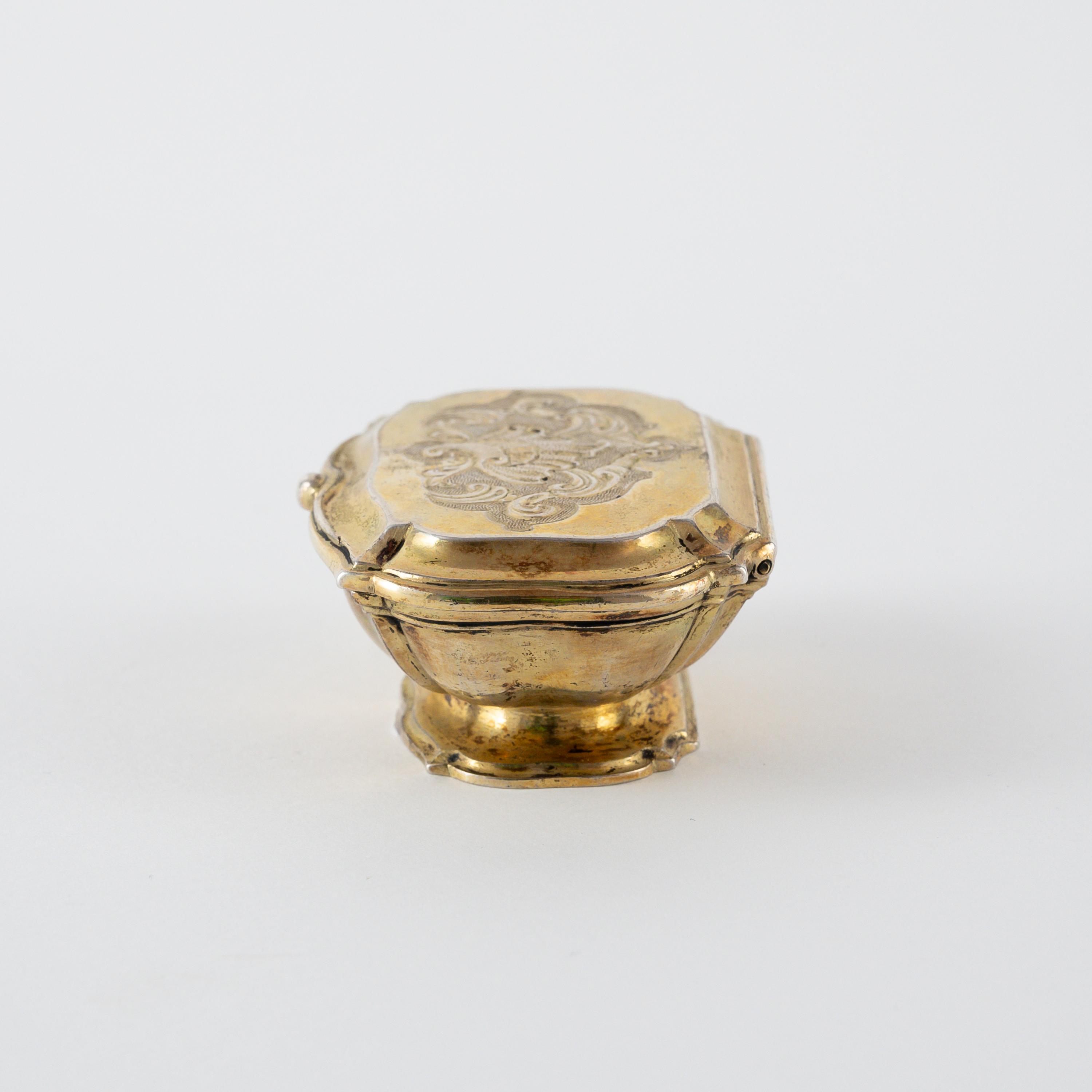 Beschreibung: Kleiner ovaler, passiger Fuß mit entsprechendem, Korpus. Der scharnierte Deckel fein