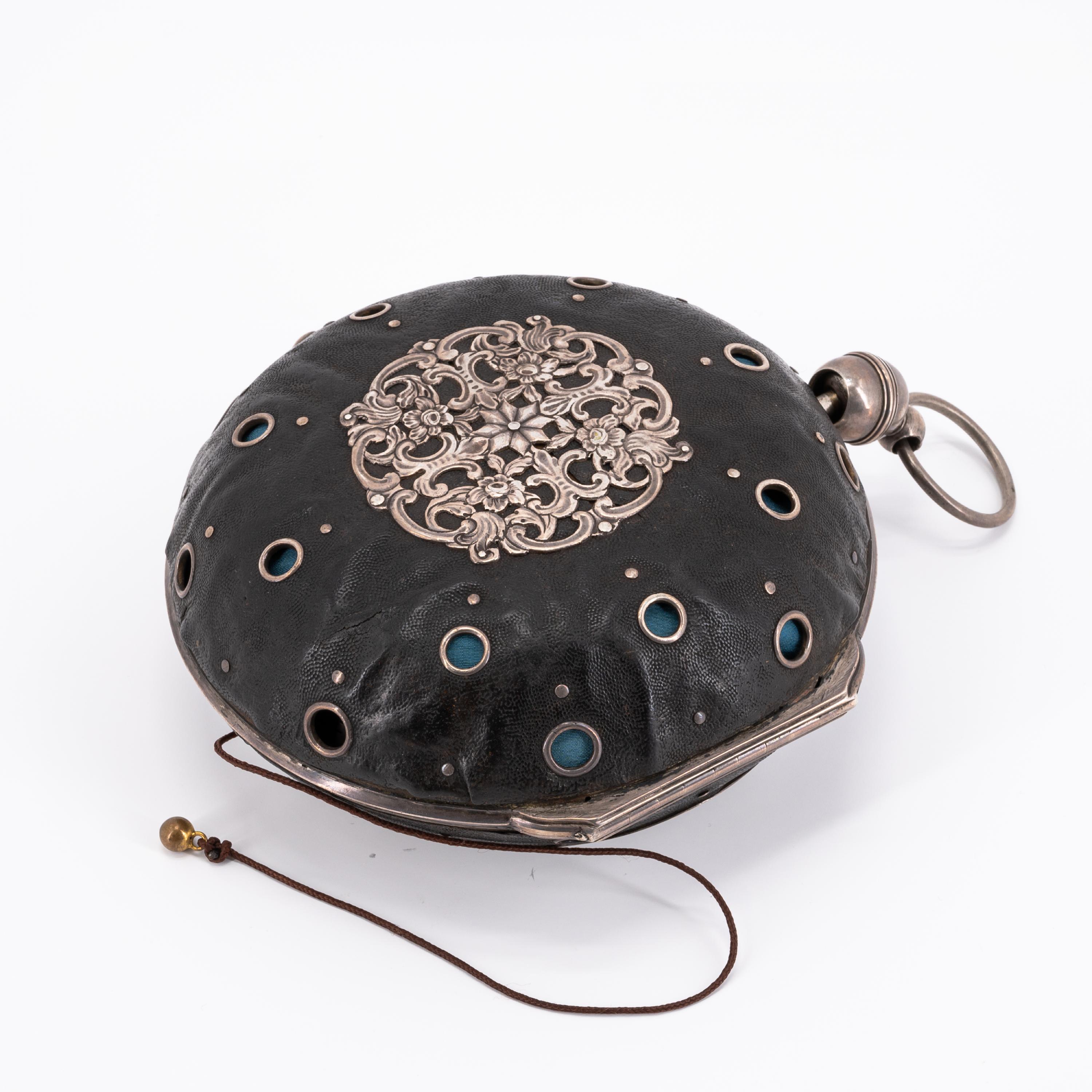 eingelegtem, floral durchbrochenem Ornament. Das Uhrgehäuse mit großem Tragering an