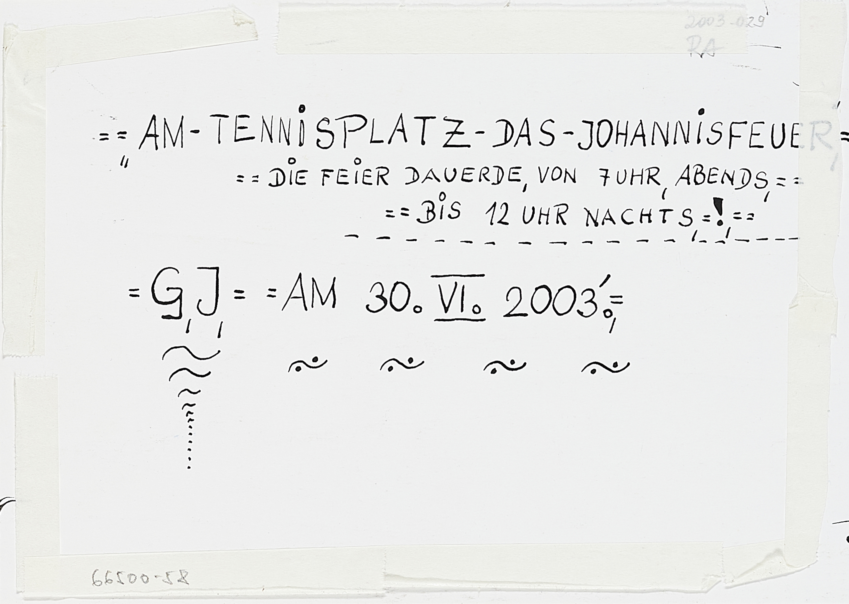 Bezeichnung: Betitelt, monogrammiert und datiert am unteren Rand: AM-TENNISPLATZ-DAS-JOHANNISFEUER G.J. 2003. Verso bezeichnet.