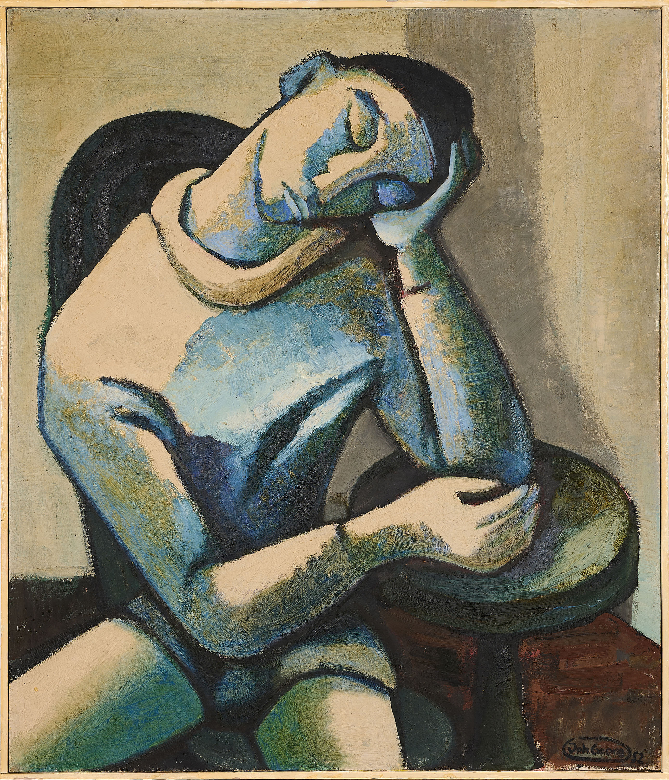Bezeichnung: Signiert und datiert unten rechts: Joh. Georg 52. Sowie signiert, betitelt und datiert verso: Joh. Georg Müller "Harlekin" XII 1952.